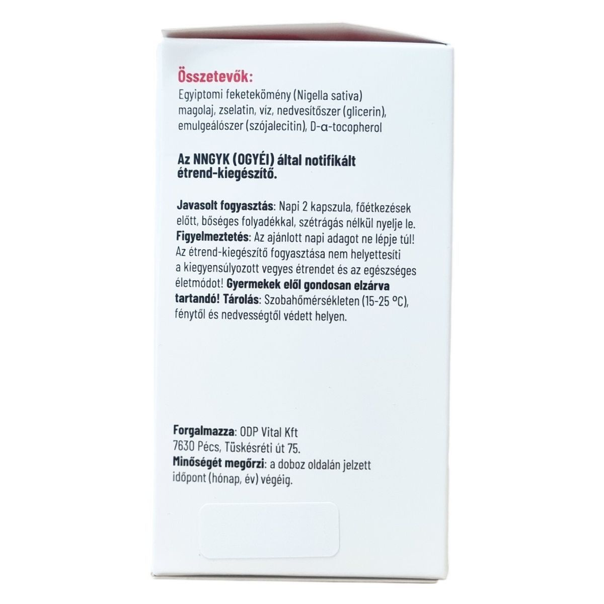 Egyiptomi feketekömény (Nigella sativa) magolaj, zselatin, víz, nedvesítőszer (glicerin), emulgeálószer (szójalecitin), D-α-tocopherol
