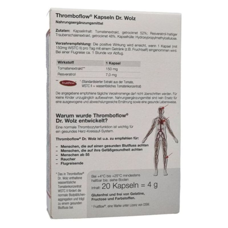 A Thromboflow® Dr. Wolz a normál vérlemezkefunkció támogatására lett kifejlesztve, ami fontos a szív- és érrendszer egészsége szempontjából. Ajánlott azok számára, akik odafigyelnek az egészséges véráramlásra és érrendszerük állapotára, különösen 55 év felettieknek, dohányzóknak és utazóknak. A készítmény vízoldékony paradicsomkivonatot (WSTC II) tartalmaz, amelynek hatása tudományosan igazolt. A napi ajánlott mennyiséget nem szabad túllépni. Kisgyermekektől elzárva tartandó. Az étrend-kiegészítő nem helyettesíti a kiegyensúlyozott, változatos étrendet és az egészséges életmódot.