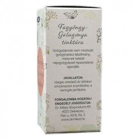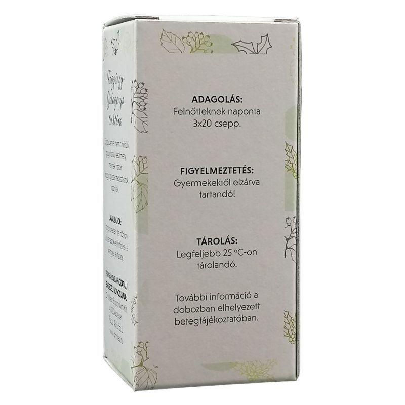 Mit kell tudnia a szedés megkezdése előtt? A készítmény egyszeri adagja (20 csepp) 0,30-0,32 g alkoholt tartalmaz, ezért a készítmény alkohol tartalmát figyelembe kell venni májbetegség és epilepszia esetén. Alkalmazása káros lehet alkoholbetegek, várandósak és gyermekek számára. Szedhetik-e a készítményt gyermekek is? A készítmény gyermekek számára nem alkalmazható figyelembe véve alkohol tartalmát és az alkalmazási területét. Szedhető-e a készítmény más gyógyszerekkel? A készítmény alkoholtartalma miatt az alkohollal kölcsönhatásba lépő gyógyszerekkel nem szedhető. Egyes szívre ható gyógyszerekkel (pl.: szívglikozidok), vérnyomáscsökkentőkkel együtt szedve, azok hatását fokozhatja. Szedhető-e várandóság és szoptatás idején? Ezen élethelyzetekben alkalmazása nem ajánlott. Hogyan és mikor kell a készítményt bevenni? A Fagyöngy-galagonya tinktúrát étkezések előtt kevés folyadékkal ajánlatos bevenni. Mi az ajánlott adag? Az ajánlott napi adag felnőtteknek: 3x20 csepp. Milyen nem kívánt hatást válthat ki a készítmény? A készítmény előírásszerű alkalmazása esetén nem ismeretesek mellékhatások. Ennek ellenére egyéni érzékenység a készítmény hatóanyagával szemben felmerülhet. Ilyen esetben forduljon orvosához, gyógyszerészéhez. Mire kell még ügyelnie a készítmény szedése során? A Fagyöngy-galagonya tinktúra gyermekek elől gondosan elzárandó! Mennyi ideig szedhető a készítmény? A készítmény hosszú ideig, kúraszerűen alkalmazható, általában 4-6 hét után célszerű néhány napos szünetet tartani. Hogyan kell tárolni a készítményt? Legfeljebb 25 fokon tárolandó.