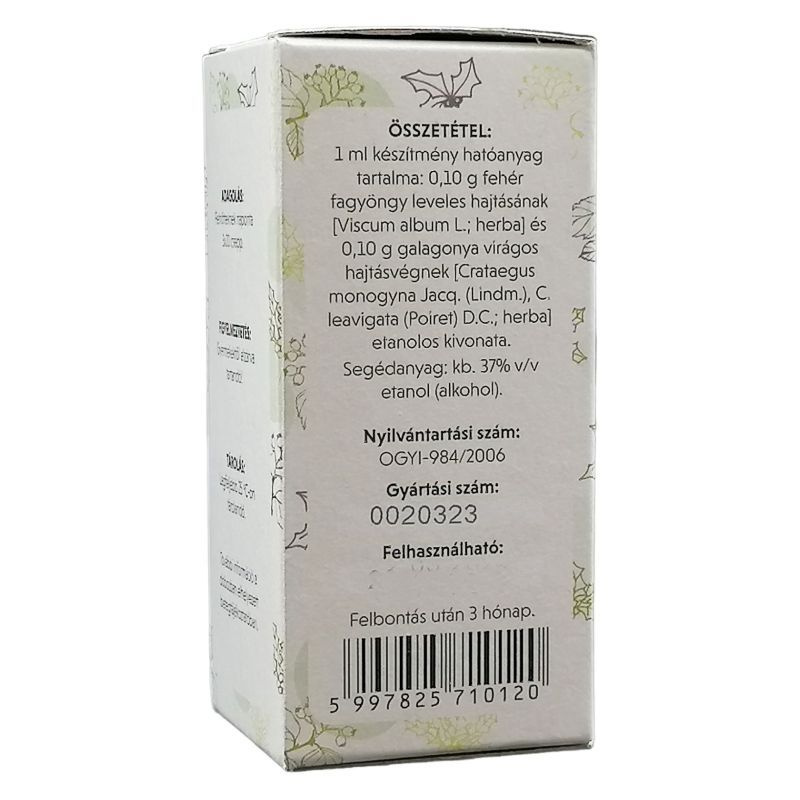 Mi a hatóanyaga? 3,00 g fehér fagyöngy leveles hajtásának (Visci albae stipes) és 3,00 g galagonya virágos hajtásvégének (Crataegi folium cum flore) alkoholos kivonata/30 ml. Mit tartalmaz még a készítmény? Segédanyagként 35-37% v/v alkoholt tartalmaz. Mikor nem szabad a készítményt szedni? A hatóanyagok iránti túlérzékenység esetén a készítmény alkalmazása ellenjavallt.