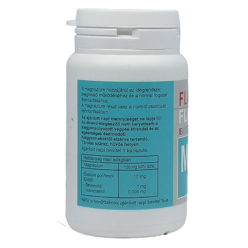 A flavonoidokkal (amelyek a szabadgyökök káros hatása ellen védik a szervezetet) együtt a magnéziumnak nagy szerepe van a szív és érrendszeri betegségek megelőzésében. A csontanyagcsere fontos szereplője és számos enzim alkotórésze. Ajánlott napi bevitel: 1 kapszula. Az ajánlott napi mennyiséget ne lépje túl! Az étrend-kiegészítő nem helyettesíti a vegyes étrendet és az egészséges életmódot! Összetevők: Flavin 7 bioflavonoid komplex (vörös szőlő mag-héj szárítmány; cirok mag-héj szárítmány; feketeszeder mag-héj szárítmány; feketecseresznye héj szárítmány, feketeribizli mag-héj szárítmány, pirosribizli mag-héj szárítmány, szilva héj szárítmány almahéj szárítmány, magnézium-karbonát. A kapszula borítása: színezék (titán-dioxid), zselatin. A kapszula széthúzható és a benne lévő tartalom anélkül is elfogyasztható.