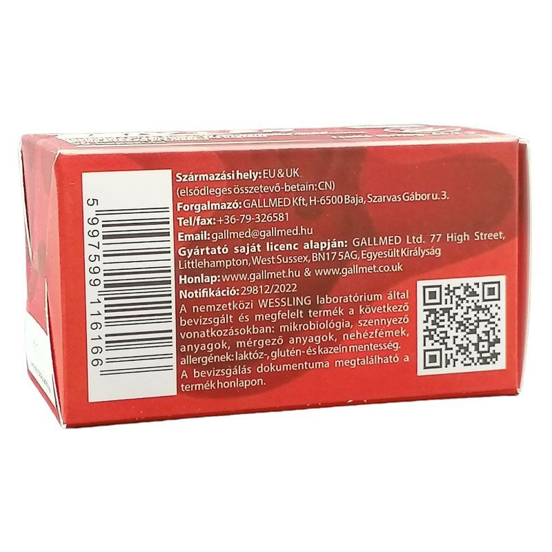Betain alapú étrend-kiegészítő kapszula B-vitaminokkal és krómmal. Összetevők: Betain, Terminalia Chebula kivonat, B6-vitamin, B12-vitamin, B9-vitamin (folát), Króm