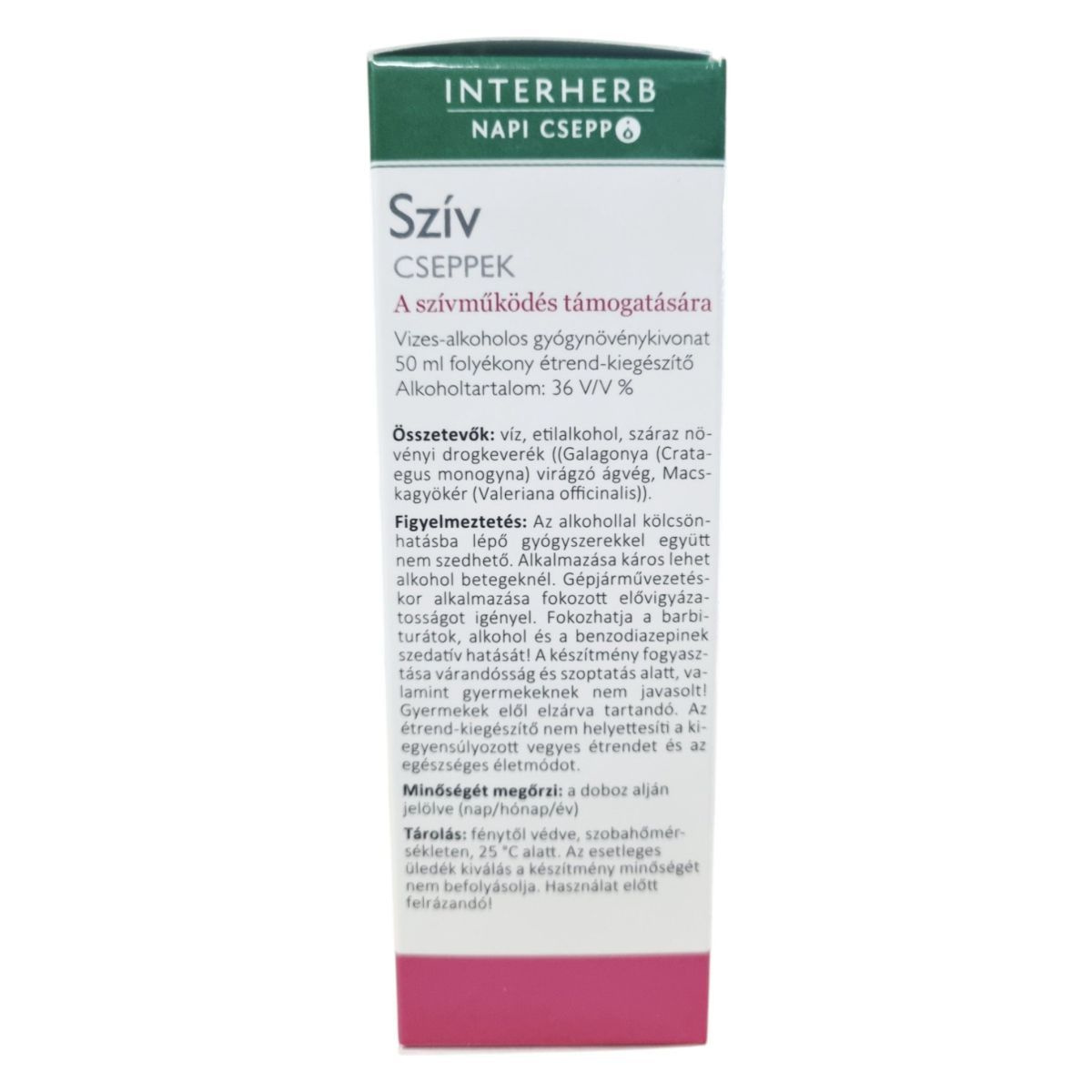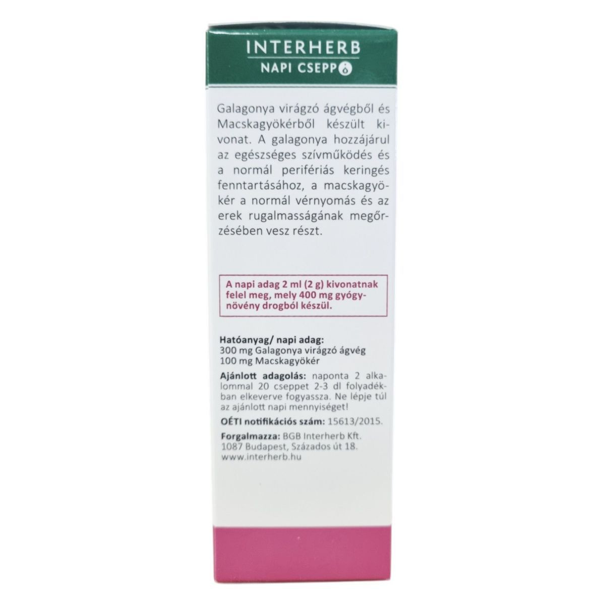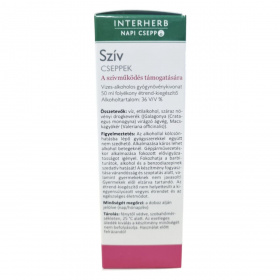 Az INTERHERB NAPI CSEPP Szív CSEPPEK egy vizes-alkoholos gyógynövénykivonat, amely galagonya és macskagyökér összetevőket tartalmaz. A galagonya hozzájárulhat az egészséges szívműködéshez és a normál perifériás keringés fenntartásához, míg a macskagyökér a normál vérnyomás és az erek rugalmasságának megőrzésében vehet részt. Az alkoholos készítmény 36 V/V % alkoholt tartalmaz, és különös figyelmet igényel a használata, különösen gépjárművezetéskor vagy más szedatív hatású anyagokkal együtt. A termék nem ajánlott várandós vagy szoptató nőknek, illetve gyermekeknek.