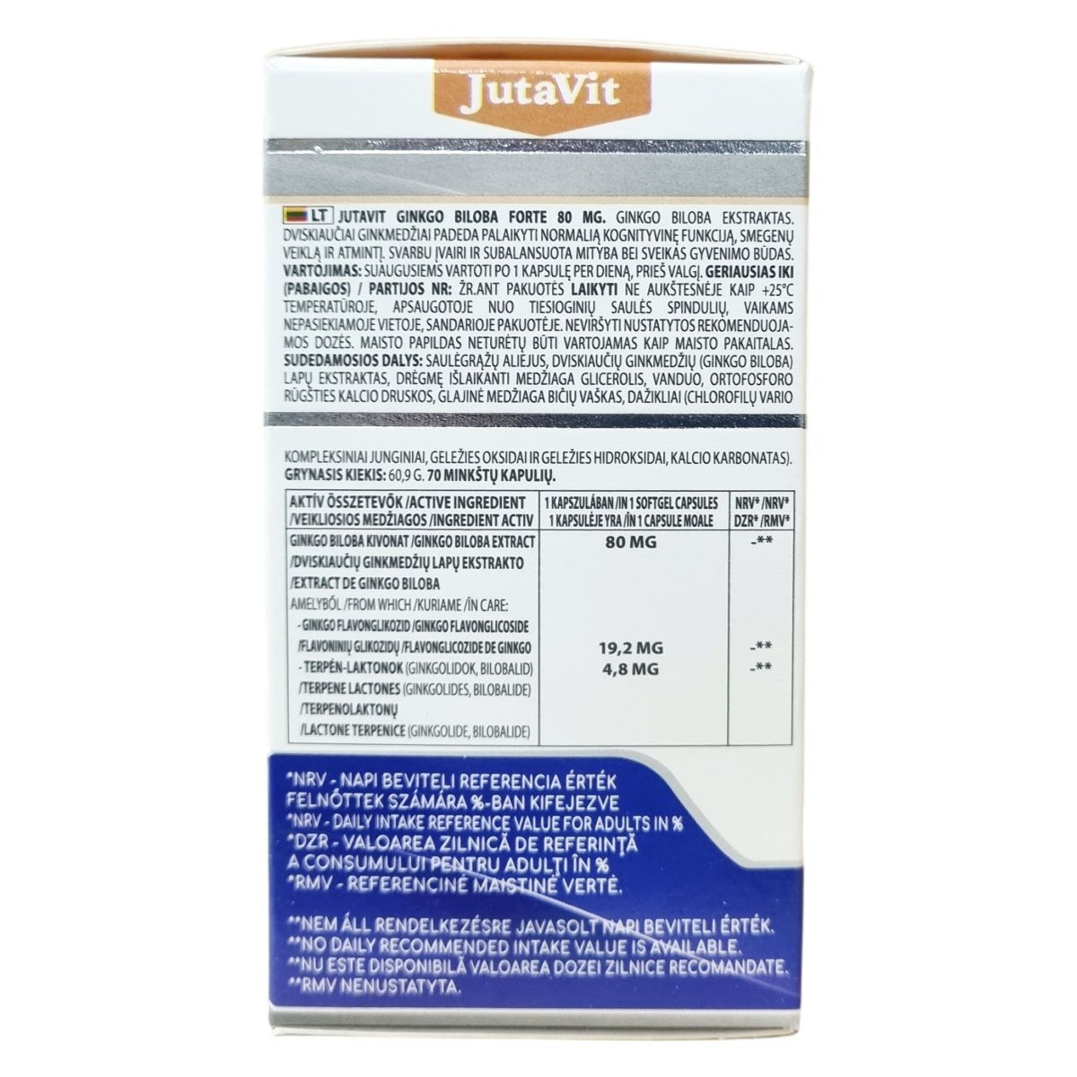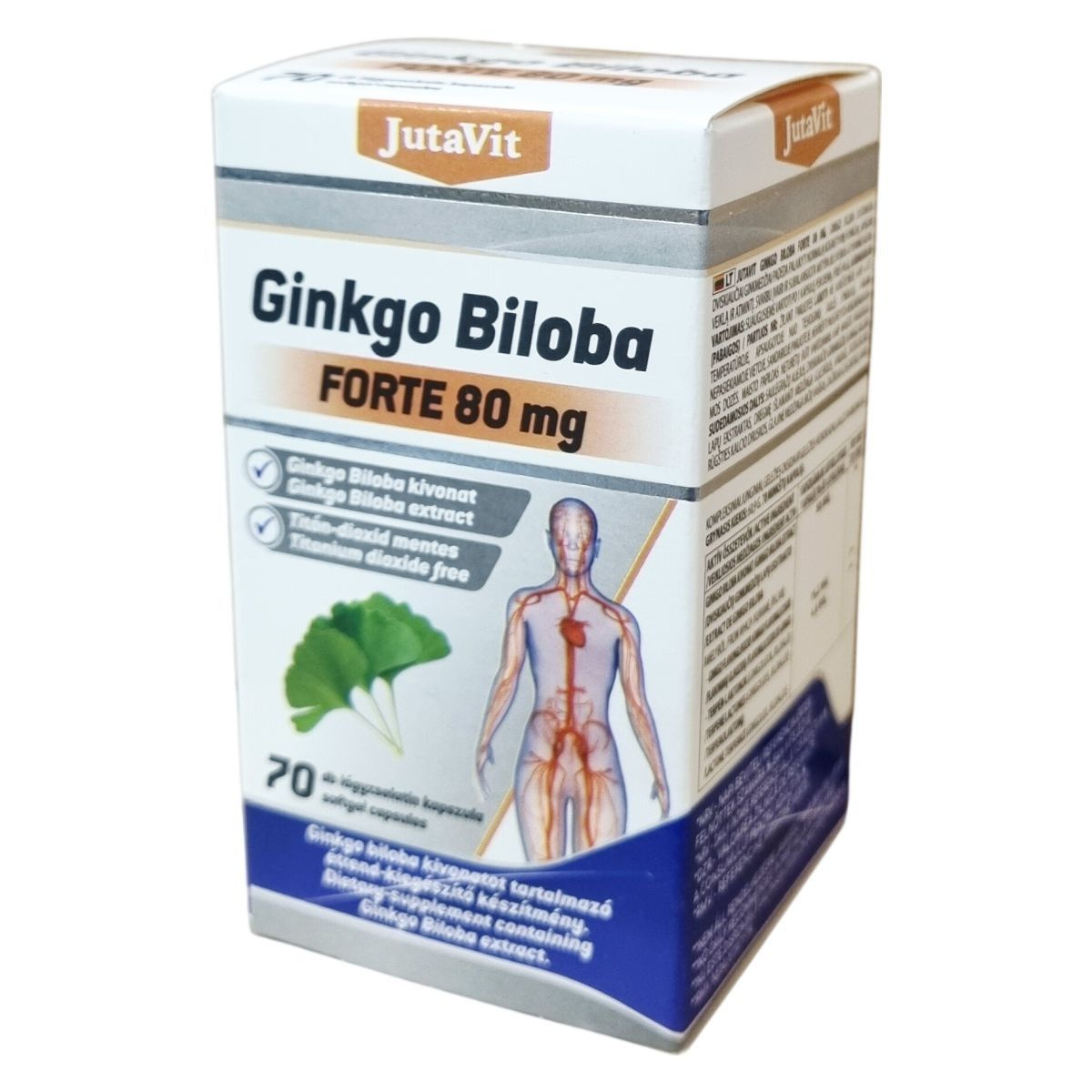 A JutaVit Ginkgo Biloba FORTE 80 mg lágyzselatin kapszula Ginkgo Biloba kivonatot tartalmazó étrend-kiegészítő, amely a páfrányfenyő speciális leveleiről készül. A Ginkgo Biloba az egyik leghosszabb életű fafaj, melynek egyes példányai több mint ezer évesek. A készítmény hozzájárulhat a perifériás keringési rendszer működéséhez, különösen előnyös lehet a hallás és látás fenntartásában. Időskorban támogathatja az agyműködés megfelelő szinten tartását. A termék 70 db lágyzselatin kapszulát tartalmaz, amelyek napraforgóolajat, zselatint és nedvesítőszerként glicerin tartalmaznak, valamint különféle segédanyagokat, mint a kalcium-foszfát, fehér és sárga méhviasz, valamint színezékek (klorofil rézkomplex, vas-oxidok, vas-hidroxidok és kalcium-karbonát). A termék használata nem ajánlott terhesség és szoptatás alatt, illetve véralvadásgátló vagy acetilszalicilsav szedése esetén, valamint műtét előtt. Cukorbetegek esetében orvosi konzultáció szükséges a használat előtt. A kapszulák tárolása szobahőmérsékleten, fénytől védve, és gyermekek elől elzárva javasolt.