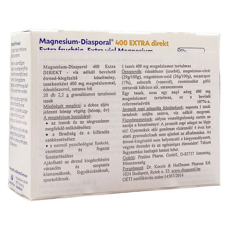 Extra gyümölcsös narancsos ízű, szájba szórható direkt granulátum. Cukor-, glutén- és laktózmentes. Kiszerelés: 20 ill. 50 db direkt granulátumot tartalmazó tasak. Termékismertető: A magnézium hozzájárul: - a normál izomműködéshez, - az idegrendszer megfelelő működéséhez, - a fáradtság és kifáradás csökkentéséhez, - a normál csontozat és fogazat fenntartásához, - a normál pszichológiai funkció fenntartásához.