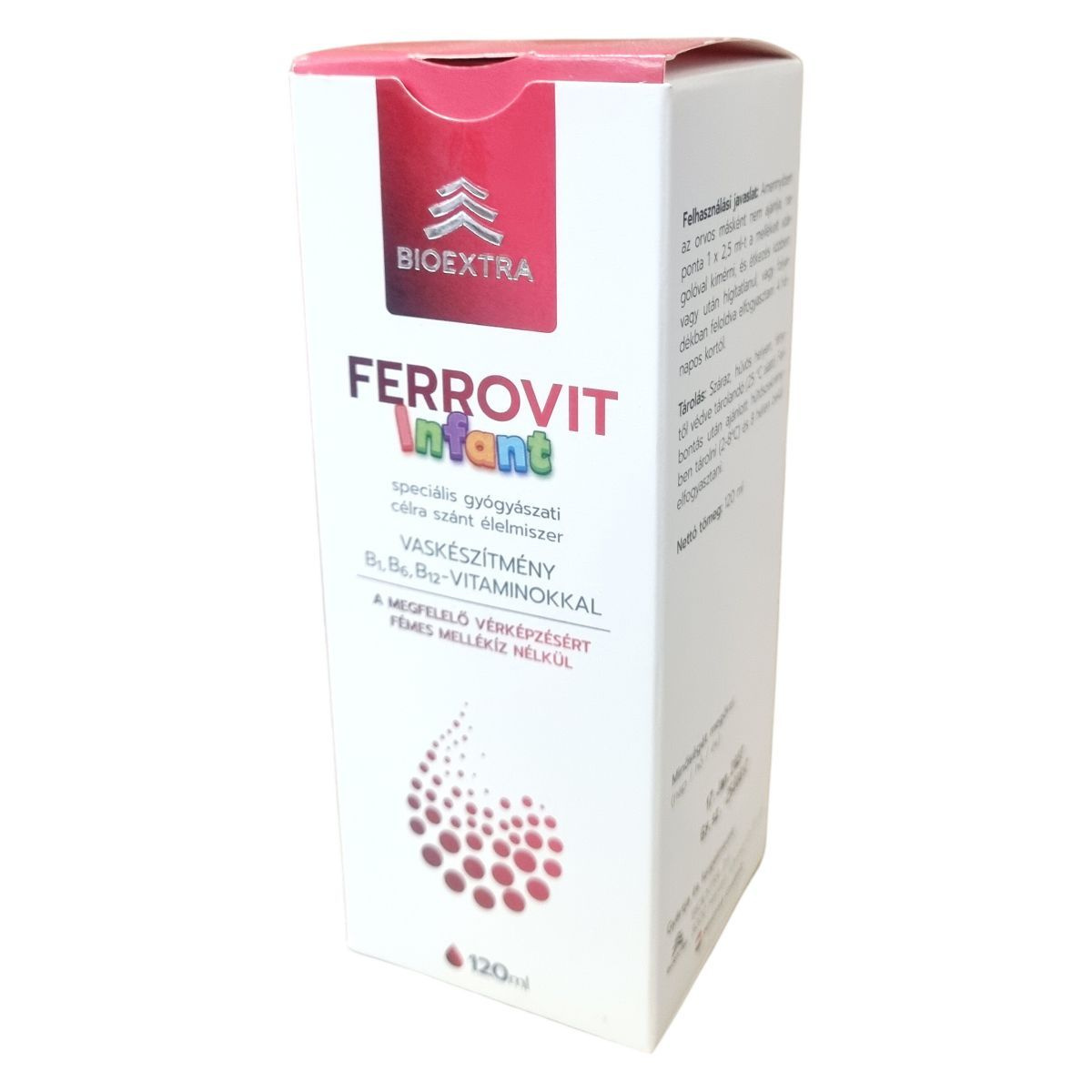 A BIOEXTRA FERROVIT Infant egy különleges gyógyászati célra szánt élelmiszer, amely vasat valamint B1-, B6- és B12-vitaminokat tartalmaz. Kifejezetten vashiányos csecsemők diétás ellátására fejlesztették ki, hogy támogassa a megfelelő vérképzést. A termék adagolása orvosi ellenőrzés mellett, a csomagoláson szereplő ajánlás szerint történjen. Felhasználása során figyelembe kell venni a figyelmeztetéseket és csak a javasolt mennyiségben szabad alkalmazni. A készítmény laktóz-, glutén- és titán-dioxid-mentes, felhasználása során biztosítani kell a megfelelő tárolást, hogy megőrizze minőségét. Nem alkalmazható parenterálisan, és használat előtt fel kell rázni. A termék nem helyettesíti a változatos étrendet és egyedüli tápanyagforrásként nem alkalmas.