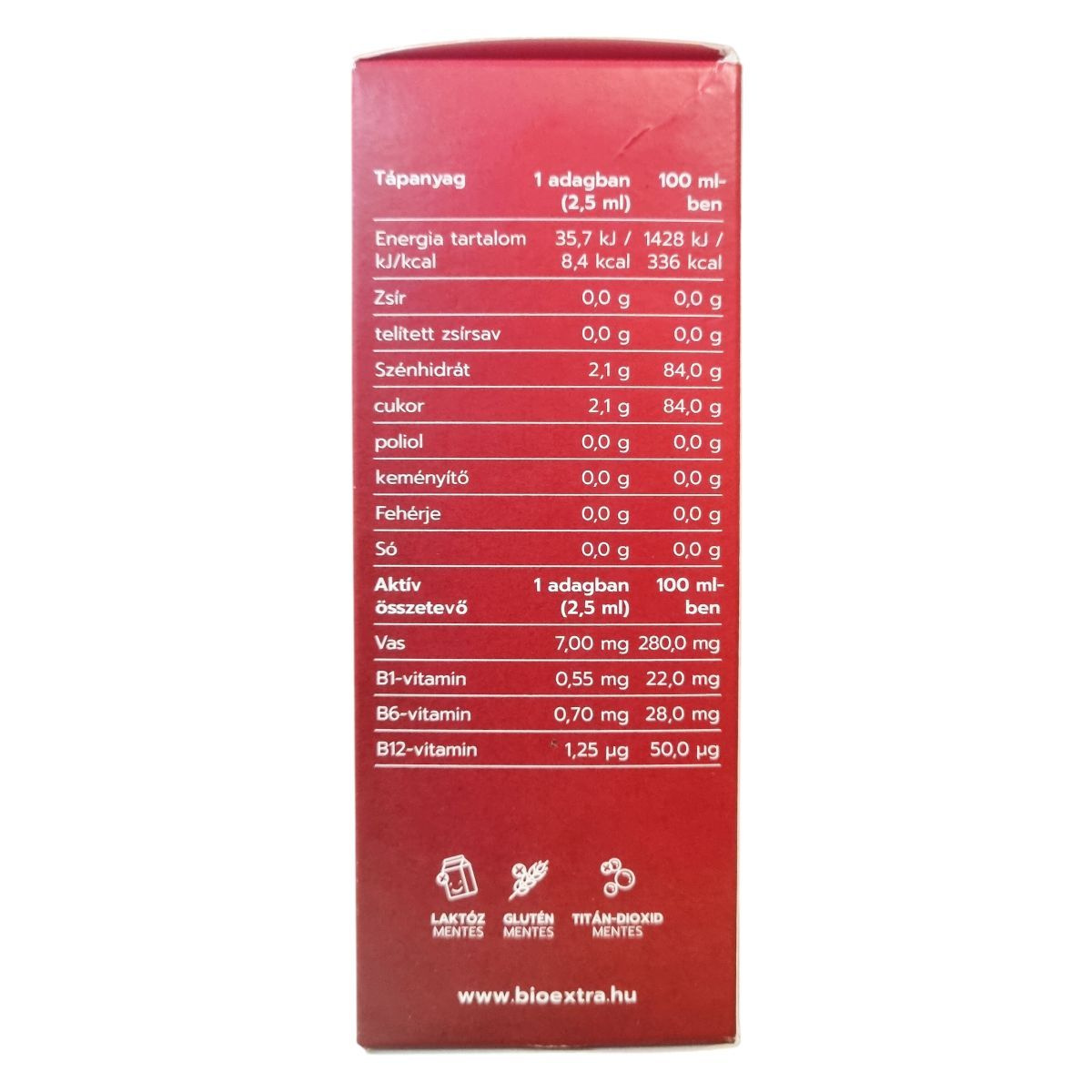 szacharóz, ioncserélt víz, vas(III)-difoszfát, piridoxin-hidroklorid, tiamin-hidroklorid, cianokobalamin