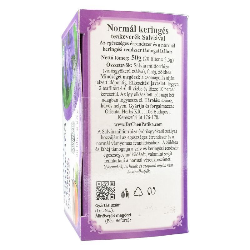 A salvia miltiorrhiza hozzájárul az egészséges érrendszer fenntartásához és elősegíti a megfelelő vérnyomás kialakulását. Jellemzők (fő hatóanyagok): Salvia miltiorrhiza, fahéj, zöldtea. Összetevők: zöldtea, Salvia miltiorrhiza, fahéj. Felhasználási javaslat: tegyen 2 teafiltert 4 dl vízbe és főzze 10 percen keresztül. Az így elkészített teát napi két adagban fogyassza el.