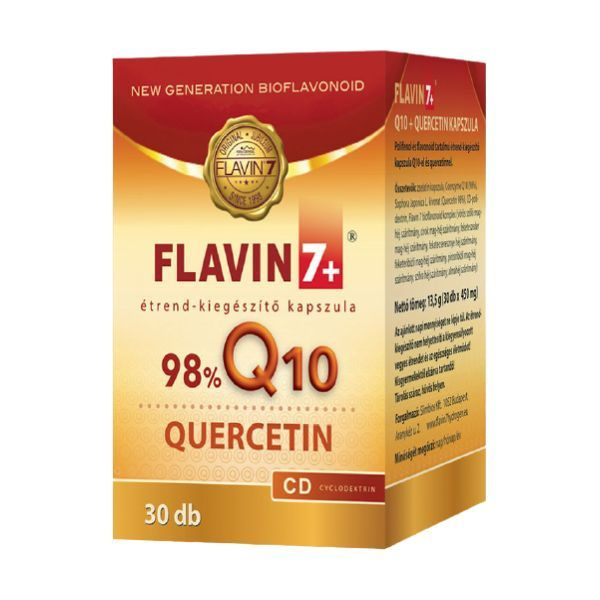 Összetevők: CoenzymeQ10 (98%), Sophora Japonica L. kivonat (Quercetin 98%), CD-polidextrin, Flavin7 bioflavonoid komplex (vörös szőlő mag-héj szárítmány, cirok mag-héj szárítány, feketeszeder mag-héj szárítmány, feketecseresznye héj szárítmány, feketeribizli mag-héj szárítmány, pirosribizli mag-héj szárítmány, szilva-héj szárítmány, almahéj szárítmány), zselatin kapszula.