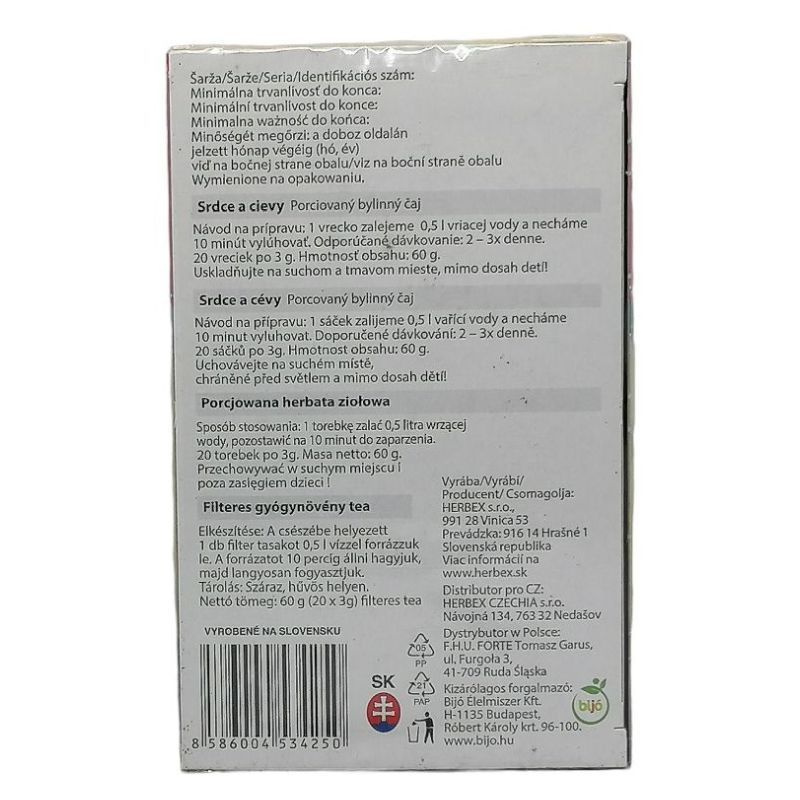 Segíti a vérzsírok és a koleszterin szint csökkentését. Összetevők: szamóca levél, homoktövis, csipkebogyó, articsóka, feketebodza bogyó, hajdina, zöld tea. Netto tömeg: 60 g, 20 db 3 g-os filter tasak. Elkészítése: 1 db filter tasakot leforrázun 0,5 l vízzel, majd 10 percig állni hagyjuk.
