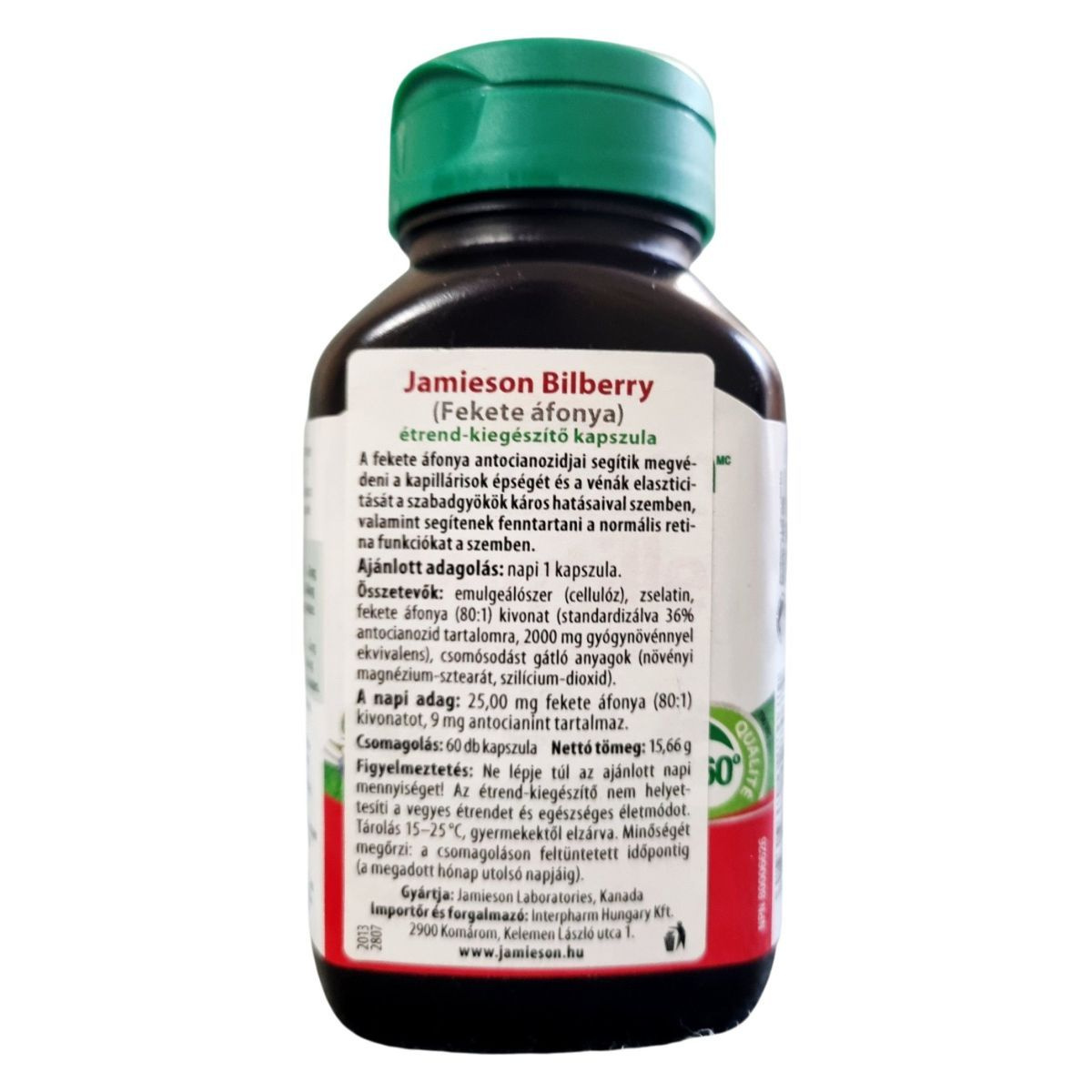 A Jamieson Bilberry étrend-kiegészítő kapszula fekete áfonya kivonatot tartalmaz, amely antioxidáns tulajdonságai révén segíthet megvédeni a kapillárisok épségét és a vénák elaszticitását a szabadgyökök káros hatásaival szemben. Továbbá, a termék hozzájárulhat a normális retina funkciók fenntartásához. A kapszula vegetáriánusok számára is alkalmas, és nem tartalmaz GMO-t, hozzáadott sót, keményítőt, glutént, laktózt, valamint mesterséges színezékeket, ízesítőket vagy tartósítószereket. A termék 60 kapszulát tartalmaz, és a gyártó ajánlása szerint felnőtteknek napi 1 kapszula fogyasztása javasolt. A termék minőségét a csomagoláson feltüntetett időpontig őrzi meg, és tárolása 15–25 °C között ajánlott, gyermekektől elzárva.