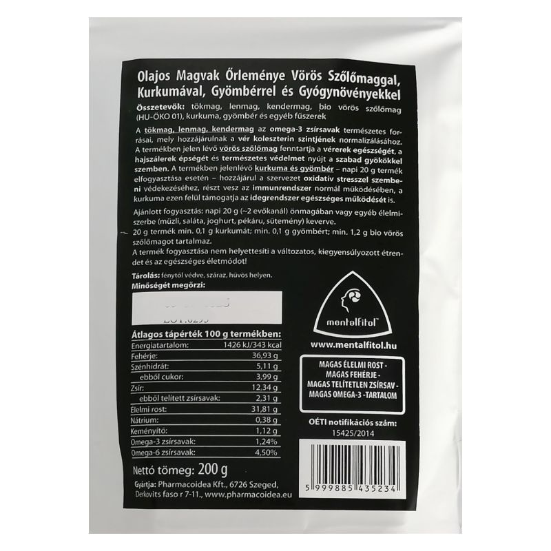 Magas rost-, növényi fehérje és Omega zsírsav tartalom. Ideális diétához. Ajánlott napi adag: 20 g (~2 evőkanál). Nettó tömeg: 200 g / tasak. A tökmag, lenmag, kendermag az Omega-3 zsírsavak természetes forrásai, mely hozzájárulnak a vér koleszterin szintjének normalizálásához. A termékben jelen lévő vörös szőlőmag fenntartja a vérerek egészségét, a hajszálerek épségét és természetes védelmet nyújt a szabad gyökökkel szemben.