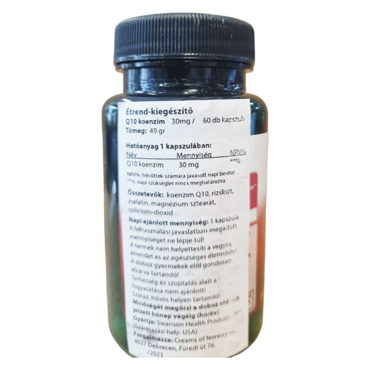 A Swanson CoQ10 étrend-kiegészítő 60 kapszulás kiszerelésben érhető el, és kapszulánként 30 mg Q10 koenzimet tartalmaz. A termék célja, hogy támogassa a szív- és érrendszer egészségét. Az összetevők között megtalálható a rizsliszt, zselatin, magnézium sztearát és szilícium-dioxid. A termék használata során fontos, hogy ne lépjük túl az ajánlott napi mennyiséget, és tartsuk távol gyermekektől. Terhesség és szoptatás alatt nem ajánlott a fogyasztása. A terméket száraz, hűvös helyen kell tárolni. A Swanson Health Products Inc. által gyártott terméket a Creams of Norway Kft. forgalmazza Magyarországon.