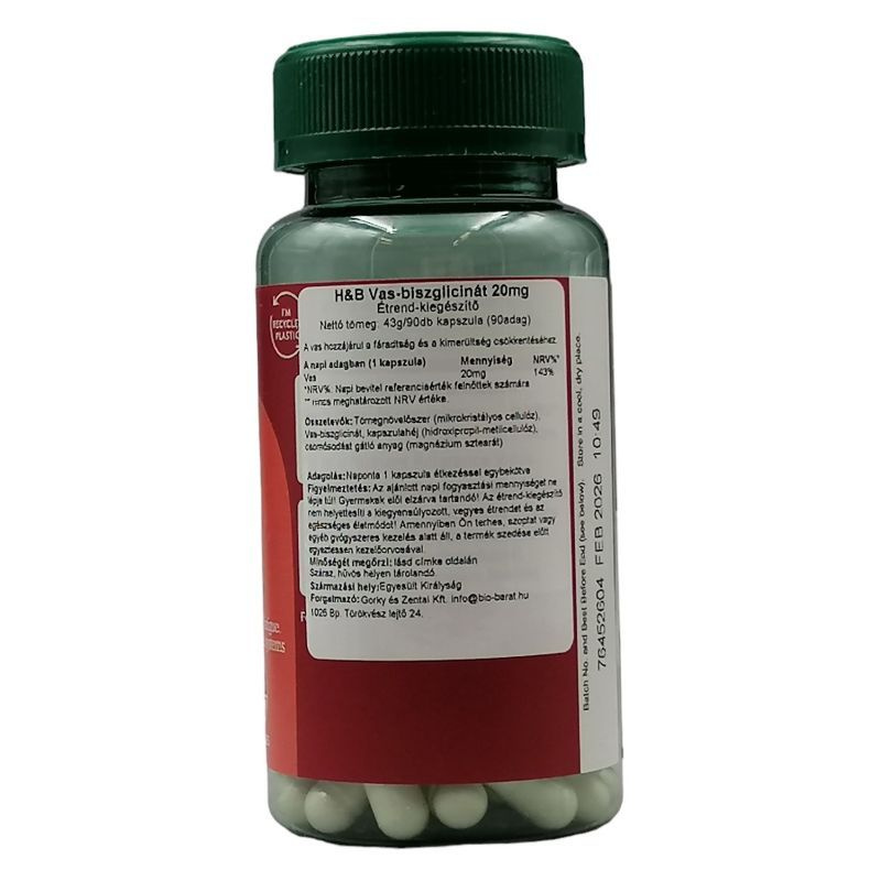 Összetevők: Tömegnövelő anyag (mikrokristályos cellulóz), vas-biszglicinát, kapszulahéj (hidroxipropil-metilcellulóz), csomósodásgátló (magnézium-sztearát).