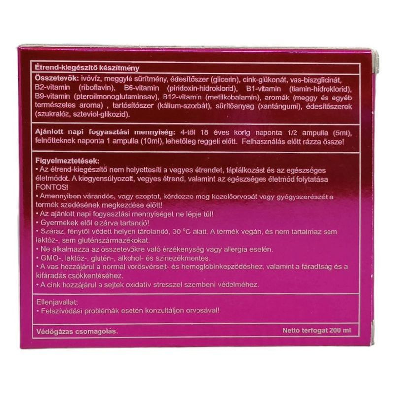 Biszglicinát formájában vasat, cinket és B-komplex vitaminokat tartalmaz egy innovatív, egyadagos finom, cseresznye ízű ivóampullás formátumban.