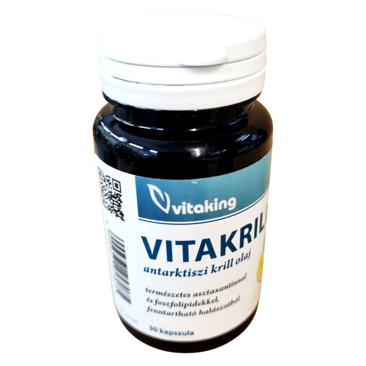 A Vitaking VITAKRILL antarktiszi krill olaj kapszula természetes asztaxantinnal és foszfolipidekkel gazdagított, és fenntartható halászatból származik. A termék 30 kapszulát tartalmaz, és napi háromszori fogyasztása ajánlott. Az EPA és a DHA hozzájárulhatnak a szív megfelelő működéséhez, míg a DHA a normál agyműködés és látás fenntartásához is hozzájárulhat. A termék nem helyettesíti a vegyes étrendet és az egészséges életmódot, és tengeri kagylókra és/vagy rákfélékre érzékenyeknek nem ajánlott. Tárolása száraz, hűvös helyen, gyermekektől elzárva javasolt.