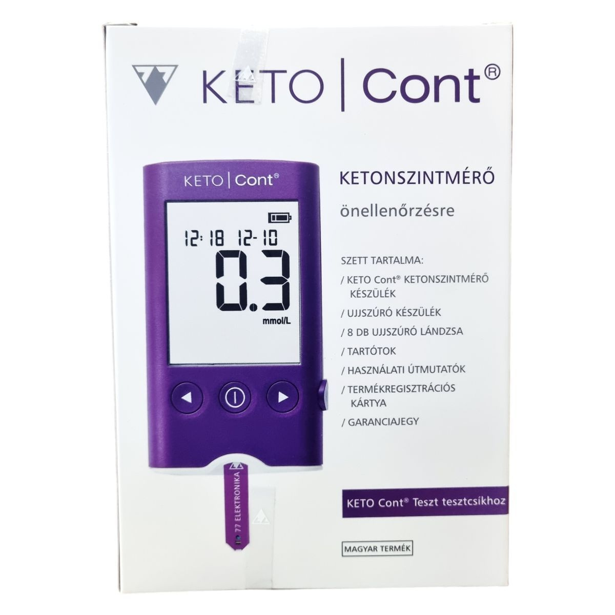A KETO Cont® ketonszintmérő készülékhez tartozó szett tartalmazza magát a mérőkészüléket, egy ujjszúró készüléket, 8 darab ujjszúró lándzsát, egy tartótokot, használati útmutatókat, termékregisztrációs kártyát és garanciajegyet. A mérési elv bioszenzoros, és a készülék USB csatlakozással, csíkkidobó funkcióval, valamint eNapló menürendszerrel rendelkezik. A készülék tesztcsíkjai speciálisan a KETO Cont®-hoz készülnek. A termék magyar gyártású, és alkalmasságát CE jelölés tanúsítja. Az eszköz alkalmas vérben lévő ketonanyag mérésére 0,1 és 8 mmol/L között, eredménye 0,3 mmol/L mért értékkel jeleníthető meg.