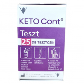 A KETO Cont Teszt β-ketonszint meghatározására szolgáló in vitro diagnosztikai tesztcsík. A termék önellenőrzésre készült, és a KETO Cont, valamint a KETO Fit készülékekkel kompatibilis. A csomag 25 darab tesztcsíkot tartalmaz. Felbontást követően a dobozon feltüntetett lejáratig felhasználható.