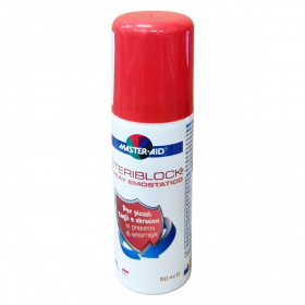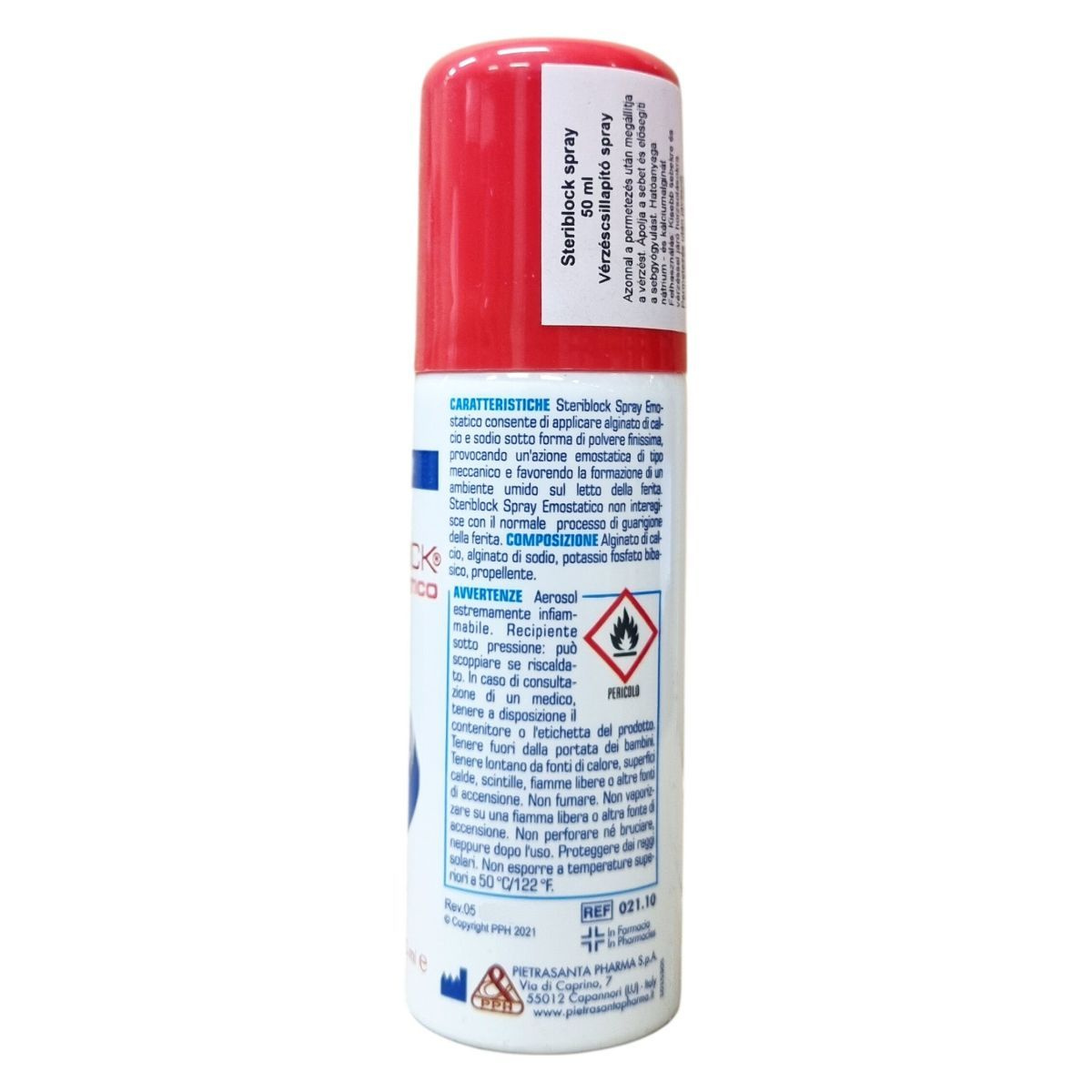 A Steriblock emosztatikus spray finom kalcium- és nátriumalginát por formájában került kifejlesztésre, amely mechanikai vérzéscsillapító hatást fejt ki, miközben elősegíti a seb nedves környezetének kialakulását a hatékony gyógyulás támogatására. A termék nem befolyásolja a seb természetes gyógyulási folyamatát és nem tartalmaz az ózonréteget károsító propellenseket. A használat során elővigyázatosság szükséges a szemekkel való érintkezés elkerülése érdekében. Az újrahasznosítás szempontjából a termék alkotóelemei elkülönítve gyűjthetők: a kupak és az adagoló műanyagból (PP 05), míg a palack alumíniumból készül.