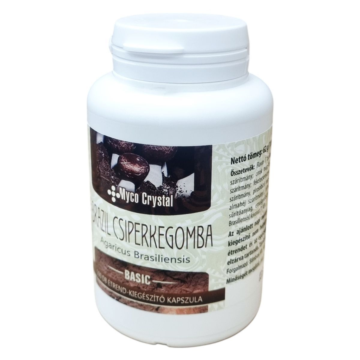A Myco Crystal Basic brazil csiperkegomba (Agaricus Brasiliensis) étrend-kiegészítő kapszula 100 darabos kiszerelésű termék, nettó tömege 62 g (100 db x 620 mg). A készítmény fő hatóanyagát a brazil csiperkegomba kivonata adja, mely 1:10 arányban koncentrált. Kiegészítésként Flavin 7 bioflavonoid komplexet tartalmaz, amely különböző gyümölcskivonatokat foglal magában, mint például vörös szőlő, feketeszeder, feketecseresznye és más bogyós gyümölcsök maghéja és héja. A kapszula HPMC (hipromellóz) alapú, cink-oxiddal, sűrítőanyaggal és emulgeálószerrel. A termék a napi három kapszula bevételével alkalmazható, ajánlott bő vízzel lenyelni. A kapszulák rendszeres fogyasztása hozzájárulhat az egészséges életmód fenntartásához, azonban nem helyettesíti a változatos, kiegyensúlyozott étrendet.
