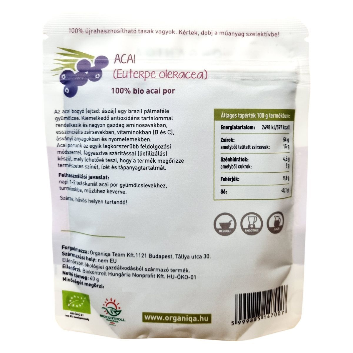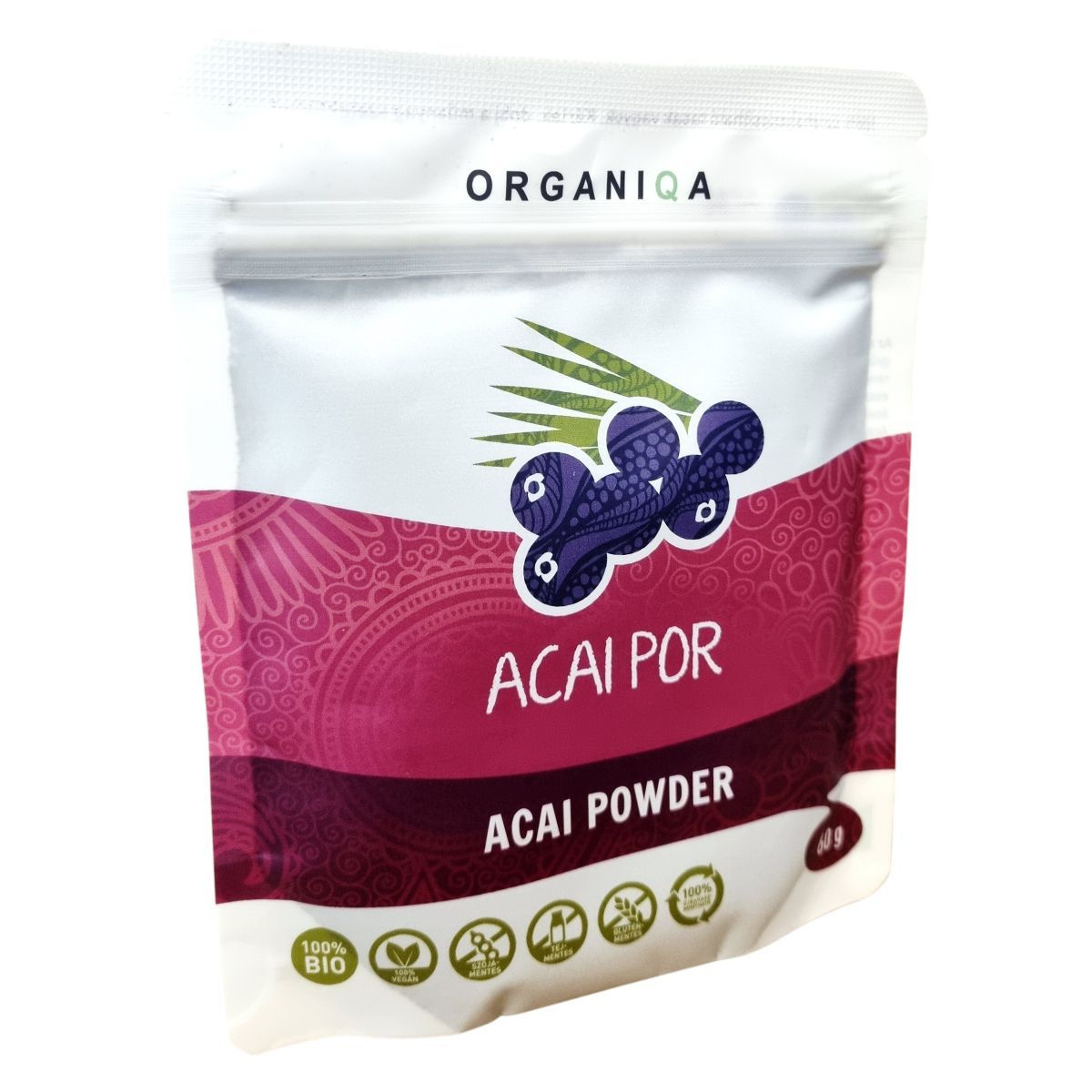 Az Organiqa Acai Por egy 100% bio termék, amely az Euterpe oleracea, azaz az acai bogyó gyümölcséből készül. A termék fagyasztva szárítással, más néven liofilizálással készül, ami lehetővé teszi, hogy megőrizze a gyümölcs természetes színét, ízét és tápanyagtartalmát. Az acai bogyó Brazíliából származik, és kiemelkedő antioxidáns tartalommal rendelkezhet, valamint gazdag lehet aminosavakban, esszenciális zsírsavakban, vitaminokban (B és C), ásványi anyagokban és nyomelemekben. A termék 100% újrahasznosítható tasakban kapható, és a műanyag szelektív hulladékgyűjtőbe dobható. Az acai por nem EU-mezőgazdaságból származik, és ellenőrzött ökológiai gazdálkodásból származó termék, amelyet a Biokontroll Hungária Nonprofit Kft. ellenőriz.
