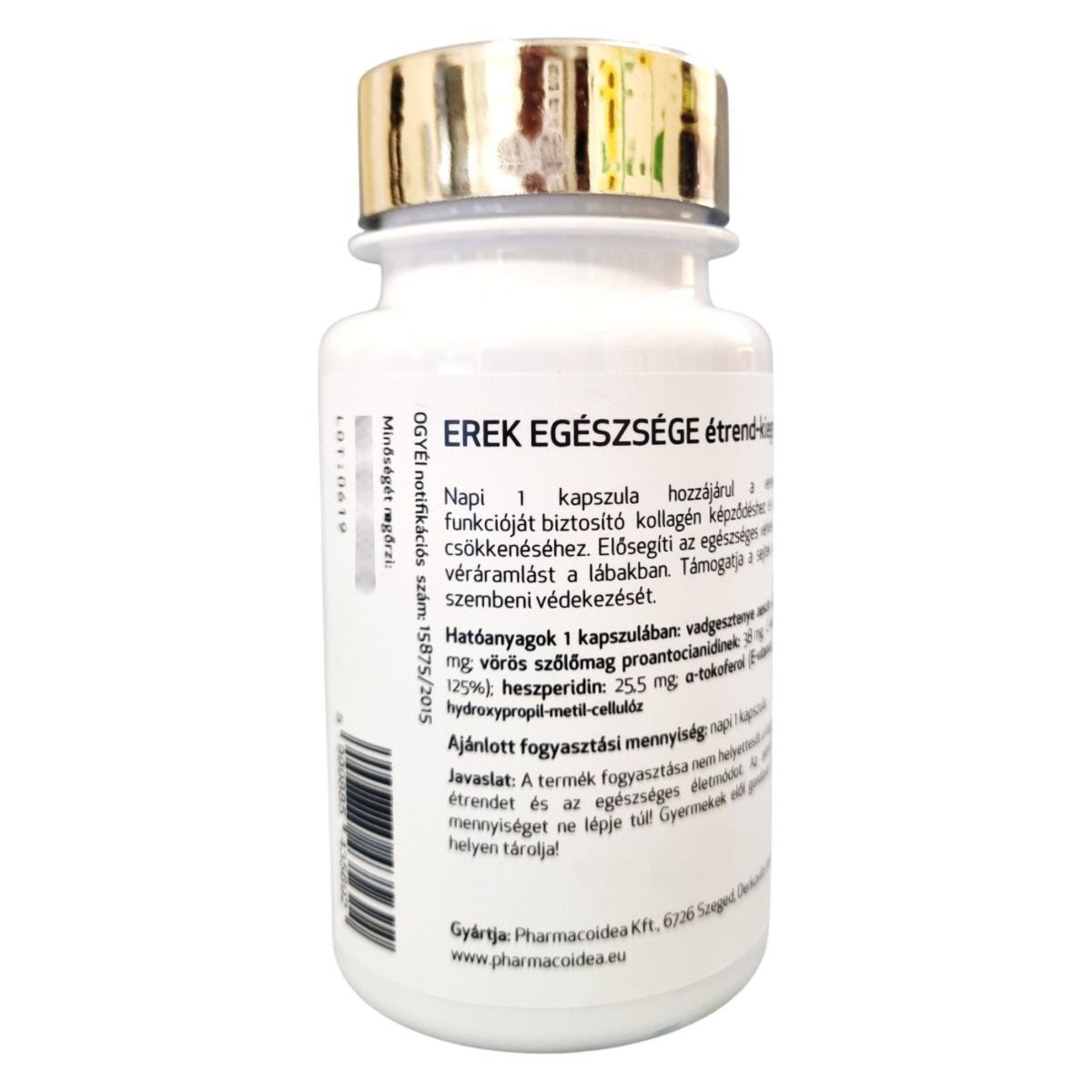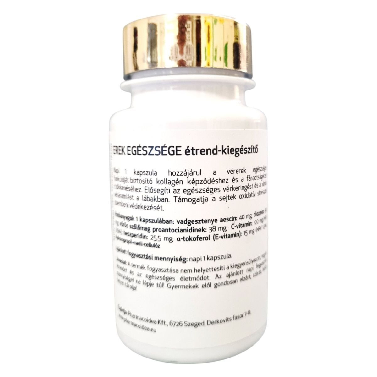 Az EREK EGÉSZSÉGE étrend-kiegészítő napi 1 kapszulája hozzájárulhat a vérerek egészséges működéséhez, a kollagén képződéséhez, és csökkentheti a fáradtságérzetet. A termék elősegítheti az egészséges vérkeringést és a vénás véráramlást a lábakban, valamint támogathatja a sejtek oxidatív stresszel szembeni védekezését. A hatóanyagok között megtalálható a vadgesztenye aescin, diozmin, vörös szőlőmag proantocianidinek, C-vitamin, heszperidin és a-tokoferol (E-vitamin). A termék gyártója a Pharmacoidea Kft., és az OGYÉI notifikációs száma 15875/2015.