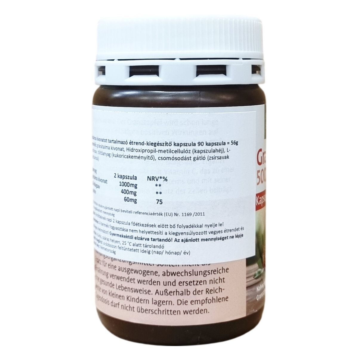 Gránátalma-kivonatot és C-vitamint tartalmazó étrend-kiegészítő. Egy kapszula 500 mg gránátalma-kivonatot tartalmaz, amelyből 200 mg ellagsav, valamint 30 mg C-vitamin. A C-vitamin hozzájárul a napi referenciaérték 75%-ához 2 kapszula esetén. A tápanyag-referenciaérték az 1169/2011/EU rendelet alapján került meghatározásra. 90 kapszulát tartalmazó kiszerelés. Származási hely: Németország.