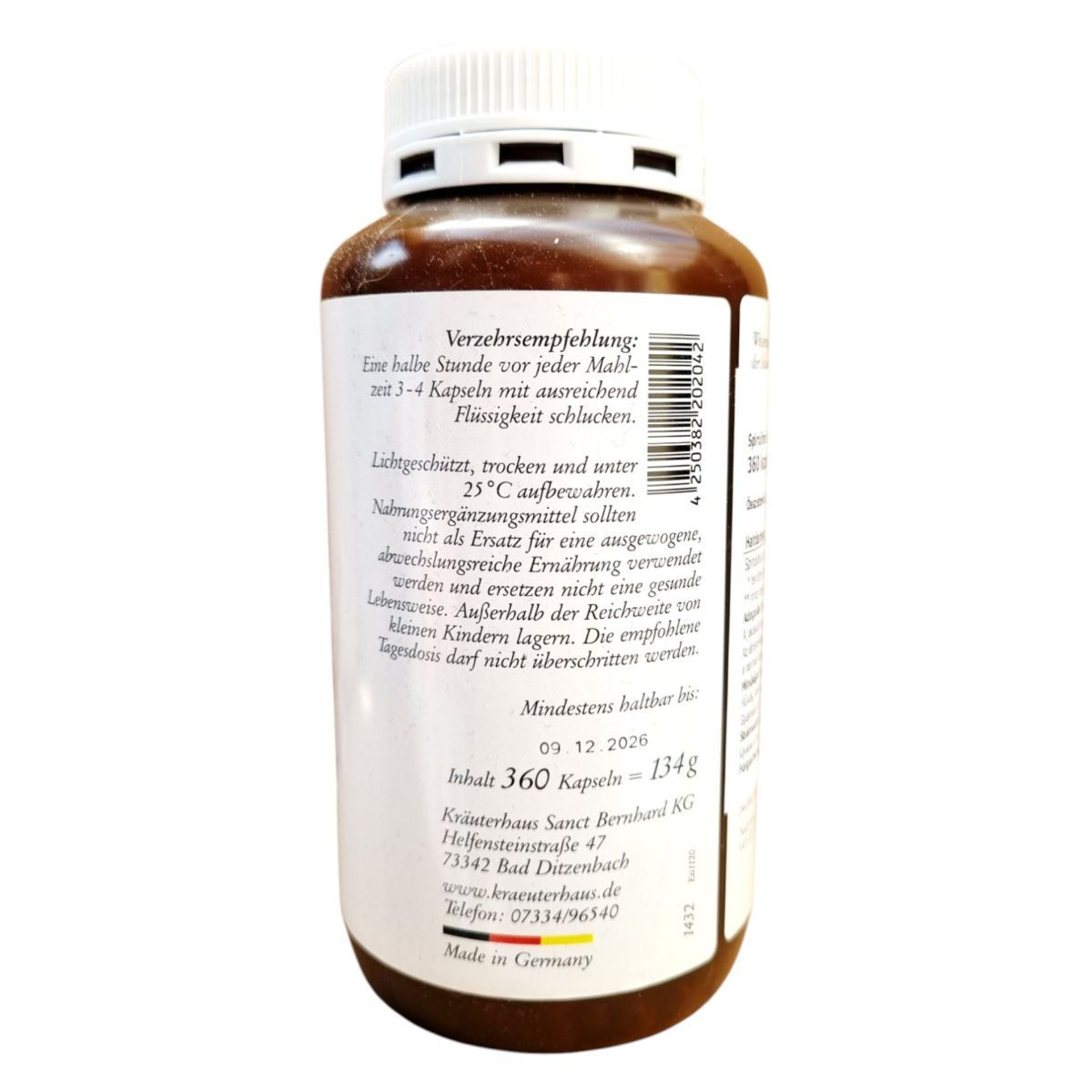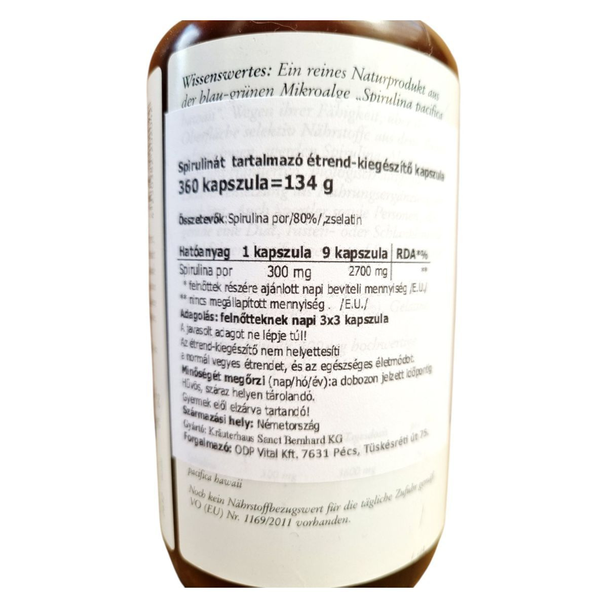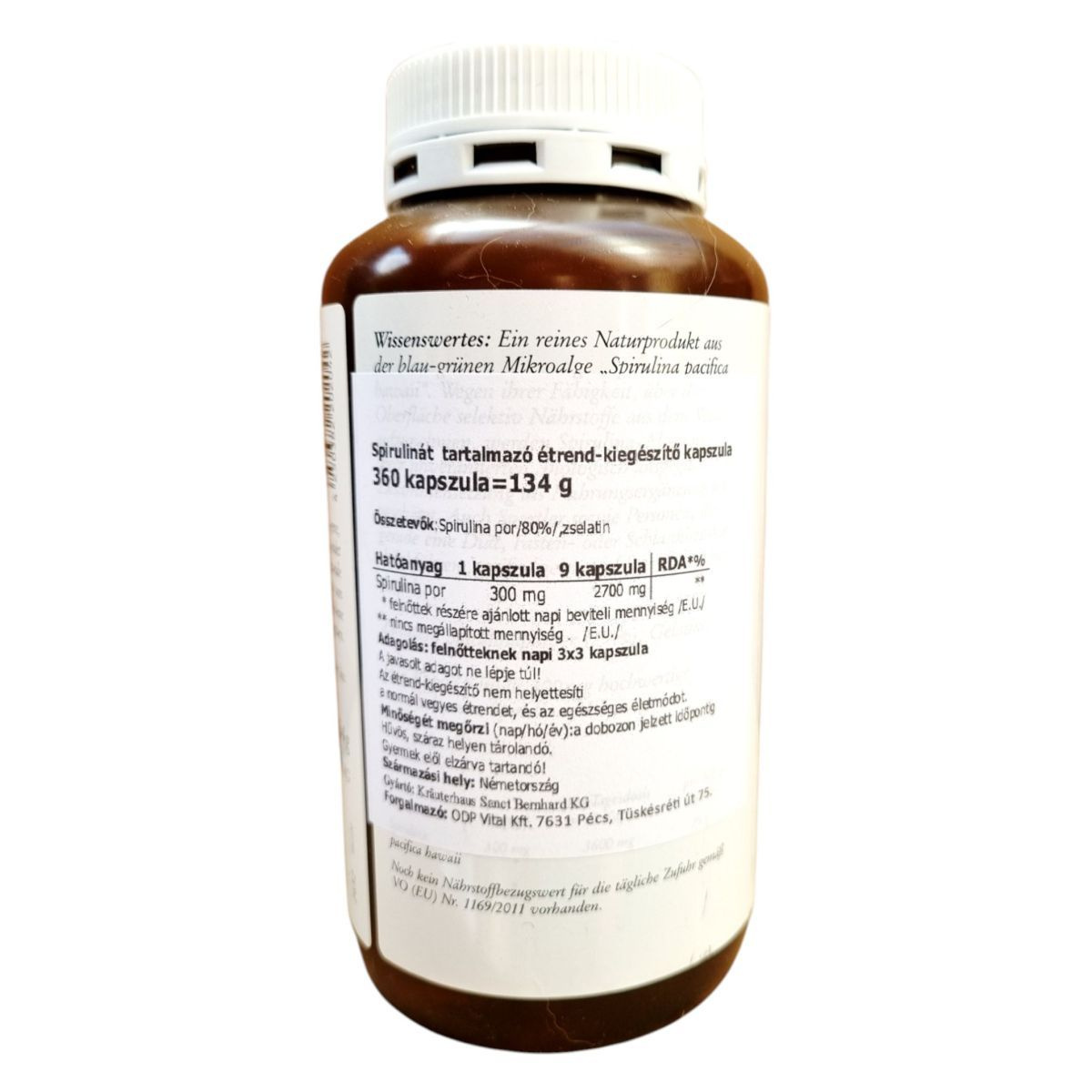 A SANCT BERNHARD Spirulina kapszula egy természetes étrend-kiegészítő, amely a Spirulina pacifica nevű kék-zöld mikroalgát tartalmazza. A termék 360 kapszulát tartalmaz, összesen 134 g súlyban. A spirulina por koncentrált formában van jelen, ami segíthet a napi tápanyagbevitel kiegészítésében. A kapszulákat étkezés előtt fél órával ajánlott fogyasztani, bő folyadékkal. A termék Németországban készült, és a Kräuterhaus Sanct Bernhard KG gyártja. Fontos, hogy az étrend-kiegészítők nem helyettesítik a kiegyensúlyozott étrendet és az egészséges életmódot.