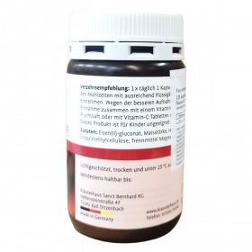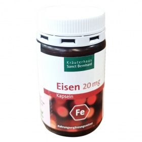 A Kräuterhaus Sanct Bernhard Eisen 20 mg kapszula Németországban készült vas tartalmú étrend-kiegészítő, amely vas-(II)-glükonátot tartalmaz. Egy doboz 120 kapszulát (49 g) foglal magában. A termék fogyasztása javíthatja a szervezet vasellátását, ami kiemelten fontos menstruáció, terhesség, szoptatás és eltérő táplálkozási szokások esetén. Az optimális felszívódás érdekében a kapszulát javasolt vitamin C-tartalmú itallal vagy tablettával egyidejűleg bevenni. A terméket gyermekek nem fogyaszthatják. A kapszulákhoz mesterséges csomósodásgátló anyagként zsírsavak magnéziumsóit használják. A tárolás hűvös, szár száraz és 25 °C alatti hőmérsékleten ajánlott. A márka és gyártó a Kräuterhaus Sanct Bernhard KG, a forgalmazó pedig az ODP Vital Kft.