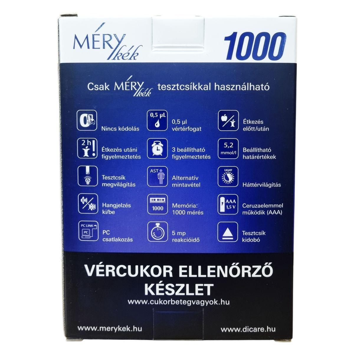 A készülék csak MÉRY kék tesztcsíkkal használható. Tartsa be a használati útmutatóban foglaltakat, és figyeljen az étkezés előtti vagy utáni mérés időzítésére. A készülék nem igényel kódolást, de használat előtt olvassa el a kezelési útmutatót.