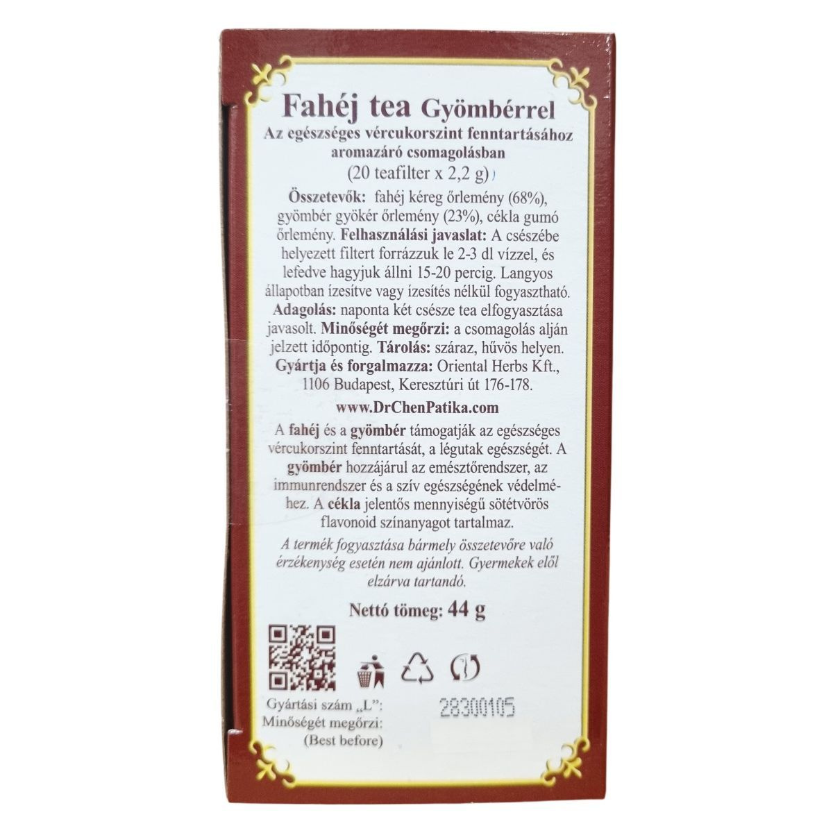 A fahéj és a gyömbér hagyományos kínai orvoslás elvei alapján összeállított formula, melyet számos kutatás igazolt hatékonysággal az egészséges vércukorszint fenntartásában. Továbbá a légutak egészségét is támogatja. A gyömbér elősegíti az emésztőrendszer, az immunrendszer és a szív egészségét. A cékla jelentős mennyiségű sötétvörös flavonoid színanyagot tartalmaz, amelyek antioxidáns tulajdonságúak. A termék aromazáró csomagolásban kerül forgalomba, így megőrzi frissességét. A javasolt adag naponta két csésze tea fogyasztása.