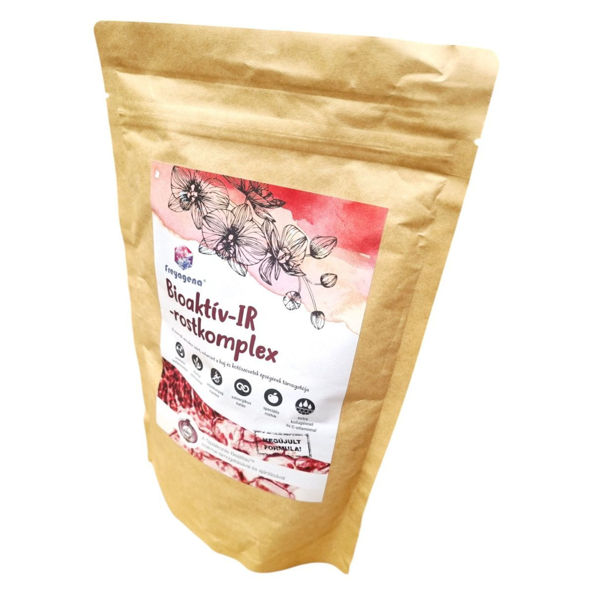 A Bioaktív-IR rostkomplex egy speciális formula, amely inositolt, marhakollagént és C-vitamint tartalmaz. Az inositol, más néven B8 vitamin, különösen hölgyek körében ismert, és hozzájárulhat a normál vércukorszint fenntartásához. A termékben található marhakollagén hidrolizált formában van jelen, ami segíthet a bőr, csontok és porcok egészségének támogatásában. A C-vitamin hozzájárulhat a megfelelő kollagénképződéshez a kötőszövetekben. A termék összetevőit a Táplálkozás-Beállítás™ szakmai támogatásával választották ki, és adalékanyag mentes. A termék gumiarábikumot, glükomannánt, alma héjat és citrus bioflavonoidokat is tartalmazhat, amelyek komplexen járulhatnak hozzá az egészség fenntartásához.