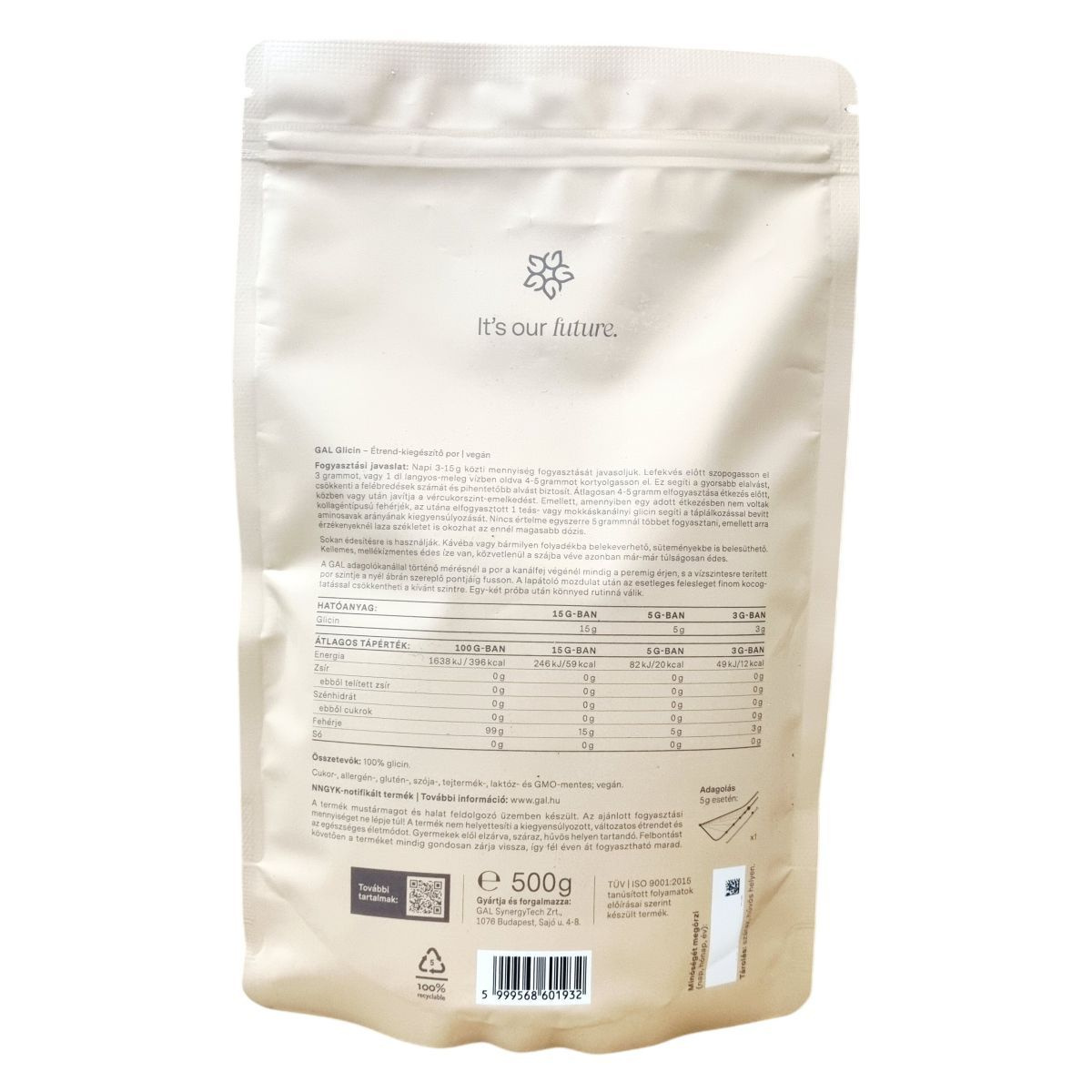 A GAL Glicin por 100%-os tisztaságú glicint tartalmaz. Italokba keverve vagy ételekhez adva is fogyasztható. Kellemes, mellékízmentes édes ízű por, amely könnyen oldódik. A csomag 500 g terméket tartalmaz.
