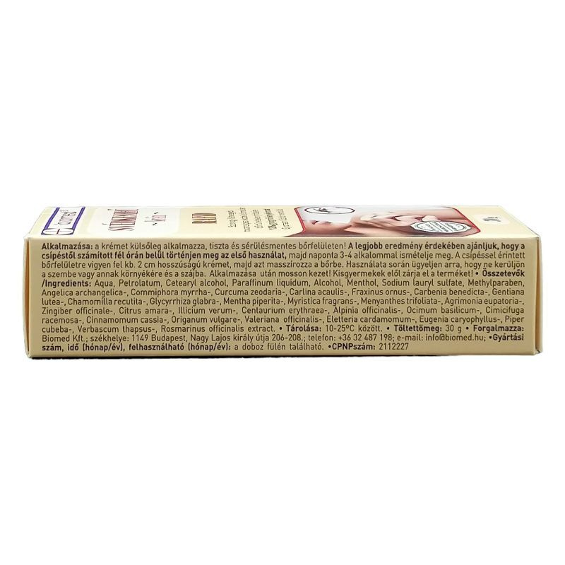Összetevők: Aqua, Petrolatum, Cetearyl alcohol, Paraffinum liquidum, Alcohol, Menthol, Sodium laurylsulfate, Methylparaben, Angelica archangelica, Commiphora myrrha, Curcuma zedoaria, Carlina acaulis, Fraxinus ornus, Carbenia benedicta, Gentiania lutea, Chamomilla recutita, Glycyrrhiza glabra, Mentha piperita, Myristica fragrans, Menyanthes trifoliata, Agrimonia eupatoria, Zingiber officinale, Citrus amara, Illicium verum, Centaurium erythrea, Alpinia officinalis, Ocimum basilicum, Cimicifuga racemosa, Cinnamomum cassia, Origanum vulgare, Valeriana officinalis, Eletteria cardamomum, Eugenia caryophyllus, Piper cubeba, Verbascum tapsus, Rosmarinus officinalis extract. Mesterséges szín- és illatanyagokat, valamint állati eredetű anyagokat nem tartalmaz!