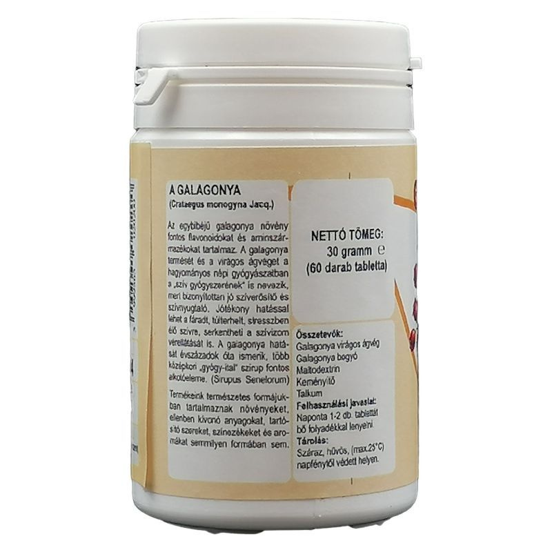 A galagonya hatását évszázadok óta ismerik, több középkori gyógy-ital szirup fontos alkotóeleme. (Sirupus Senelorum) Tablettáink természetes formájukban tartalmaznak növényeket, ellenben kivonó anyagokat, tartósító szereket, színezékeket és aromákat semmilyen formában sem, minőségi alapanyagokból, ellenőrzött gyártási körülmények között készülnek. Összetevők: Galagonya virágos ágvég, Galagonya bogyó, Maltodextrin, Keményítő, Talkum. Felhasználási javaslat: Naponta 2-3 db tablettát bő folyadékkal lenyelni.