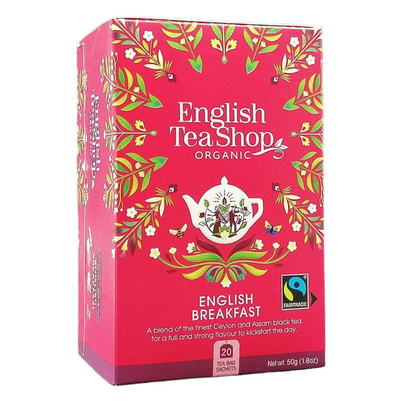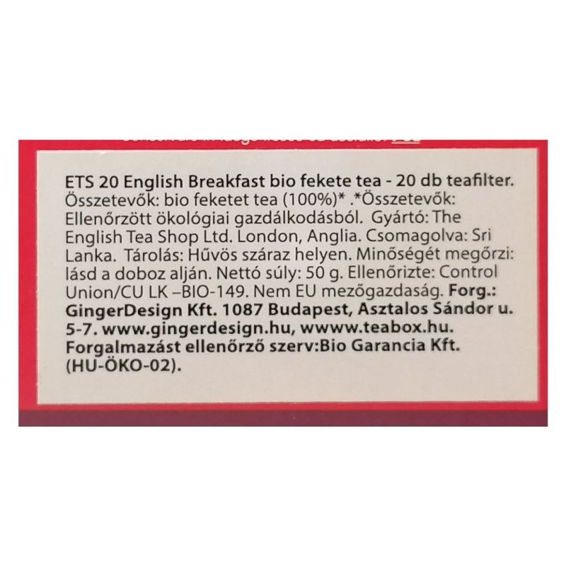 Összetevők: bio és Fairtrade Ceylon fekete tea*. *Összetevők: Ellenőrzött ökológiai gazdálkodásból. Gyártó: The English Tea Shop Ltd. London, Anglia. Csomagolva: Sri Lanka. Tárolás: Hűvös száraz helyen. Minőségét megőrzi: lásd a doboz alján.