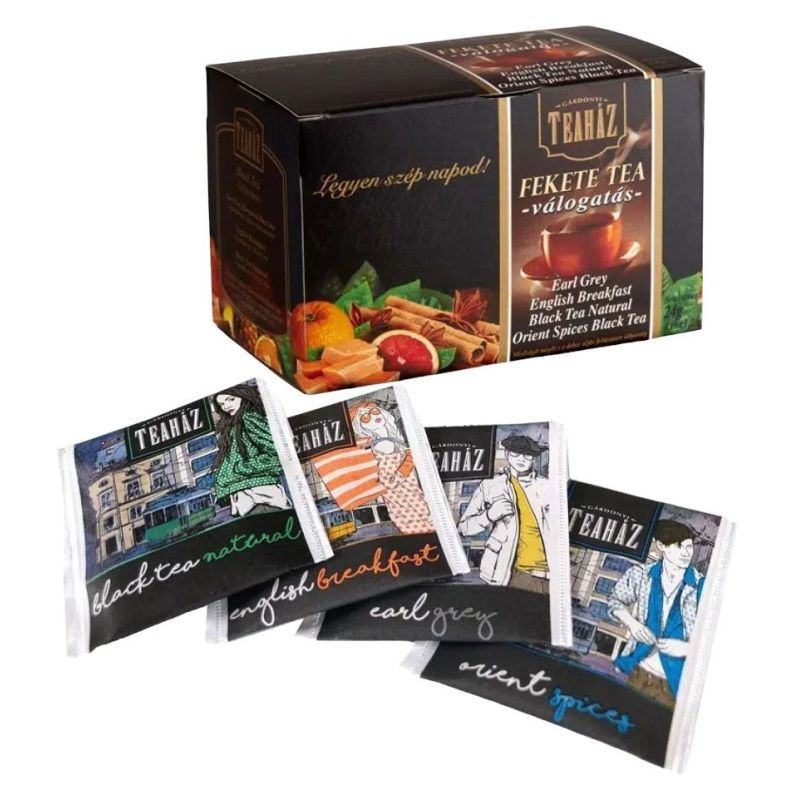Fekete tea válogatás: Earl Grey, Karamell- narancs, Exotic, Massala Chai.