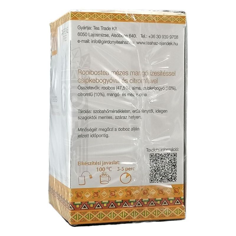 Összetevők: rooibos, alma (10%) sipkebogyó (10%), citromfű (10%), mangó természetazonos aroma.