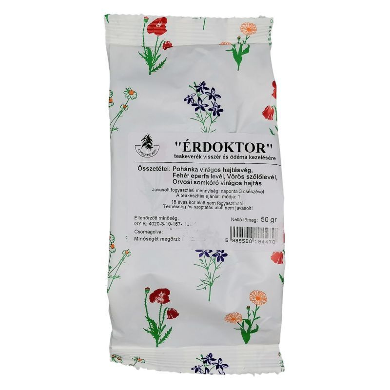 Az “ÉRDOKTOR” keringési zavarok, visszér, ödéma kiegészíto terápiához ajánlott teakeverék. Hatóanyagai erosítik az ereket és segítik a véráramlást, gátolják az erek elöregedését. Összetétel : Pohánka virágos hajtásvég, Fehér eperfa levél, Vörös szőlőlevél, Orvosi somkóró virágos hajtás. HASZNOS ISMERETEK AZ „ÉRDOKTOR” TEAKEVERÉKRŐL HOVÁ SOROLJUK? Krónikus vénás rendellenességek, keringési zavarok, visszér, ödéma kiegészítő terápiához ajánlott teakeverék. MIT TUDHATUNK A NÖVÉNYEKRŐL? A felhasznált gyógynövények mindegyike szerepel gyógyszerkönyvekben. A népgyógyászati tapasztalatok és laboratóriumi vizsgálati eredmények mellett, a terápiás hatásokat korszerű, humán klinikai kísérletek is bizonyítják. A vörös szőlő levél, pohánka virágos hajtás, fehér eperfa levél és orvosi somkóró virágos hajtás hatóanyagai egymást támogatva segítik a szervezet keringési rendszerét. MILYEN ELŐNYÖS HATÁSSAL JÁR FOGYASZTÁSA SZERVEZETÜNKRE? A vörös szőlő levél, fehér epefa levél és a pohánka virágos hajtás gyulladáscsökkentő hatása mellett flavonoid hatóanyagaik -antocianinok, rutin-erősítik az ereket és segítik a véráramlást, gátolják az erek elöregedését. Az orvosi somkóró herba esetében a kezelések során csökkent az ödéma mértéke, megszűnt a nehézláb-érzés. HOGYAN ALKALMAZZUK? 250 ml forró vízhez egy csapott evőkanál teakeverék javasolt, napi három alkalommal. 18 éves kor alatt nem adható! Terhesség és szoptatás alatt-kísérleti eredmények hiányában-nem ajánlott!