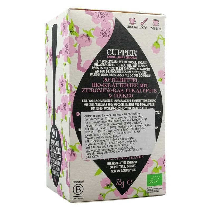 A Cupper bio zen balance tea egy különleges, bio minőségű tea, amelyet az angliai Dorsetben készítenek. A tea 1984 óta a természetes és ízletes teák híveit szolgálja ki, és célja, hogy a fogyasztók számára egy nyugtató és harmonikus élményt nyújtson. A zen balance tea egyedi ízvilágával és gondosan válogatott összetevőivel segít a mindennapi stressz kezelésében, miközben felfrissíti a testet és a lelket. A tea filteres kiszerelésben kapható, így könnyen elkészíthető, bármikor élvezhető. A Cupper bio zen balance tea nemcsak ízletes, hanem a környezetbarát megoldások iránti elkötelezettséget is tükrözi, hiszen a bio összetevők garantálják a fenntartható és egészséges életmódot.