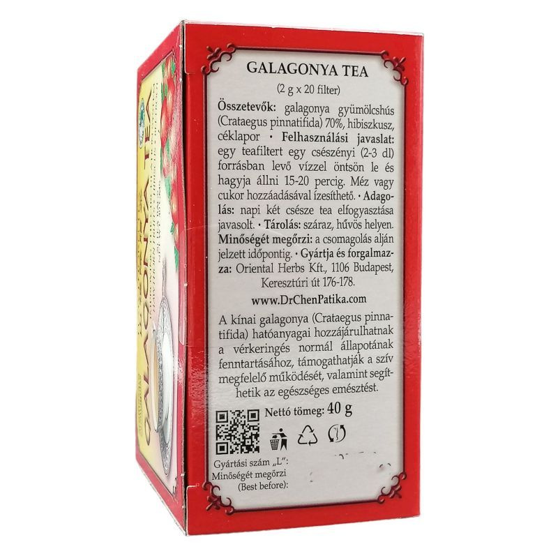 A galagonya (Crataegus pinnatifida) Kínában már évszázadok óta a mindennapi étkezés része. A karotinban, vitaminokban, flavonoidokban, szacharidokban, glikozidokban, proteinben gazdag galagonyát a távol-keleti népgyógyászatban a lép energiájának a növelésére, így az emésztés normalizálásának a segítésére használják, főként a sok húst fogyasztók. Továbbá a galagonya támogatja a szív és keringési rendszer egészségét, a tudatos szívbarát életmód elérését. Adagolás (felhasználás): naponta 2 csésze tea elfogyasztása javasolt. Összetevők: galagonya gyümölcs (crataegus pinnatifida), hibiszkusz, céklapor.