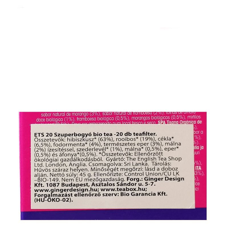 Összetevők: hibiszkusz,* rooibos,* fodormenta,* málna,* eper,* kékáfonya,* természetes málna és eper ízesítéssel. *Összetevők: Ellenőrzött ökológiai gazdálkodásból. Gyártó: The English Tea Shop Ltd. London. Nagy-Britannia. Csomagolva: Sri Lanka. Tárolás: Hűvös száraz helyen. Minőségét megőrzi: lásd a doboz alján.