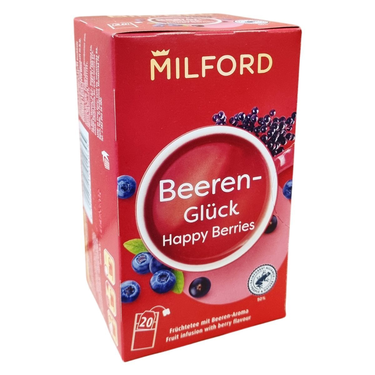 A Milford Beeren-Glück Happy Berries gyümölcstea természetes, minőségi összetevőkből áll, melyek között hibiszkusz, alma, csipkebogyó, fekete ribizli, bodzabogyó és áfonya szerepel. A termék 50%-ban Rainforest Alliance tanúsítvánnyal rendelkező alapanyagokat tartalmaz, amely fenntartható gazdálkodást biztosít. A papírdoboz és szétválasztható csomagolóanyagok a szelektív hulladékgyűjtéshez megfelelőek, a tea filter pedig komposztálható. A terméket Németországban állítják elő, majd több országbeli forgalmazóval értékesítik, többek között Ausztriában, Szerbiában, Bosznia-Hercegovinában és Montenegróban is.