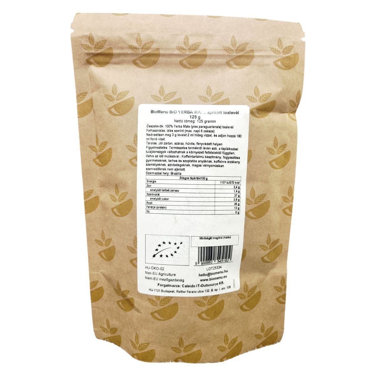 A BioMenü BIO Yerba Mate egy aprított tealevél, amely Brazíliából származik és 125 grammos kiszerelésben érhető el. Az ajánlott felhasználási mód szerint 3 gramm tealevelet 2 ml hideg vízzel nedvesítve, majd 180 ml forró vízzel leöntve készítjük el az italt. A termék 100% tiszta, organikus eredetű, és megfelel a bio, nyers valamint vegán étrendi irányzatoknak. A termék koffeintartalmú, ezért bizonyos csoportok számára nem javasolt a fogyasztása. Tartása során fontos, hogy jól zárt, száraz, hűvös és fényvédett helyen tároljuk. Mivel természetes eredetű termékről van szó, előfordulhat, hogy táplálkozási tulajdonságai a környezeti tényezők és az idő múlásával változhatnak.