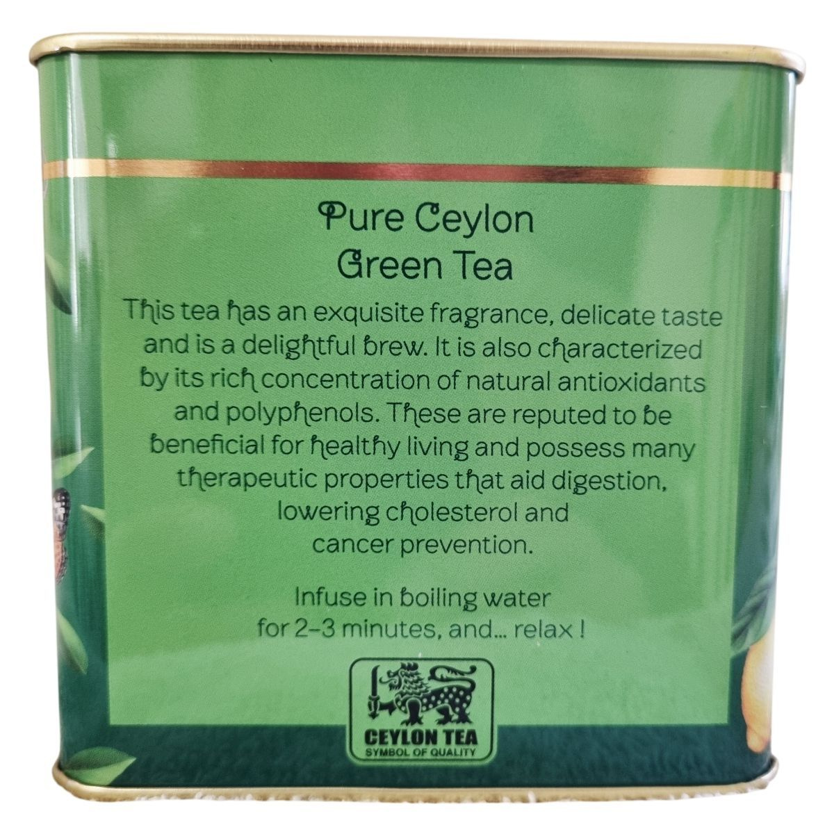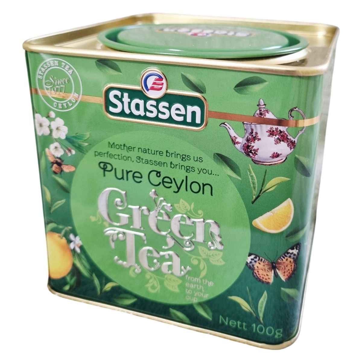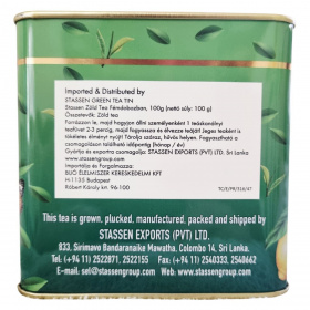 A Stassen Pure Ceylon Green Tea prémium minőségű ceyloni zöld tea, amelyet Srí Lankán termesztenek, szüretelnek és csomagolnak. A dobozon szereplő leírás szerint a tea finom illattal, kellemes ízzel és gazdag természetes antioxidáns- és polifenol-tartalommal rendelkezik. A márka üzenete: „Mother nature brings us perfection, Stassen brings you… Pure Ceylon Green Tea – from the earth to your cup.” A felhasználási útmutató szerint 2–3 perc forrázási idő javasolt. A csomagoláson több nyelvű információ található, köztük a gyártási és exportadatok, valamint a forgalmazói cím is. A fémdobozos kiszerelés aromazáró és tartós megoldást biztosít a teafű számára.