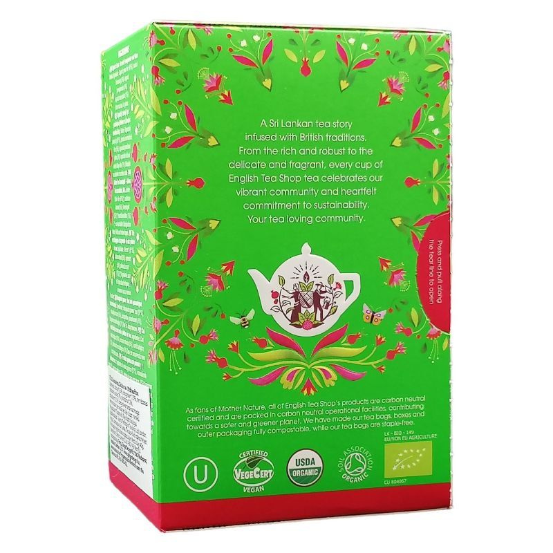 Összetevők: bio és Fairtrade zöld tea* rózsaszirmok,* gránátalma darabok,* természetes gránátalma ízesítéssel. *Összetevők: Ellenőrzött ökológiai gazdálkodásból. Gyártó: The English Tea Shop Ltd. London, Anglia. Csomagolva: Sri Lanka. Tárolás: Hűvös száraz helyen. Minőségét megőrzi: lásd a doboz alján.