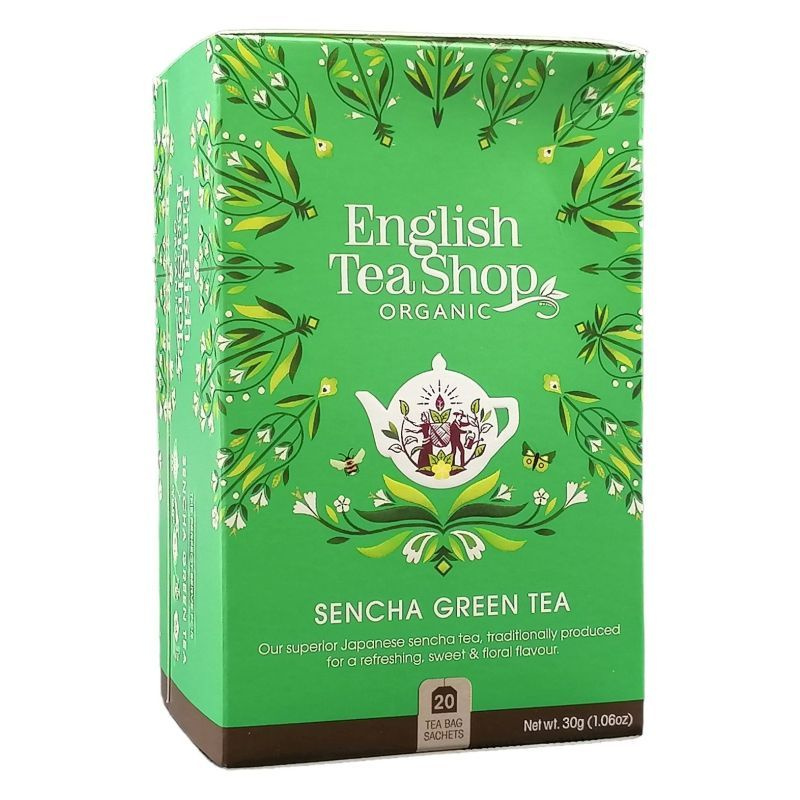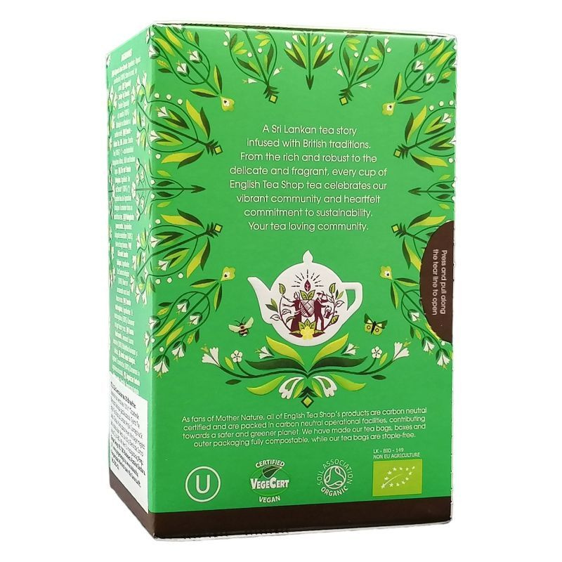 Összetevők: zöld tea*. *Összetevők: Ellenőrzött ökológiai gazdálkodásból. Gyártó: The English Tea Shop Ltd. London, Anglia. Csomagolva: Sri Lanka. Tárolás: Hűvös száraz helyen. Minőségét megőrzi: lásd a doboz alján.