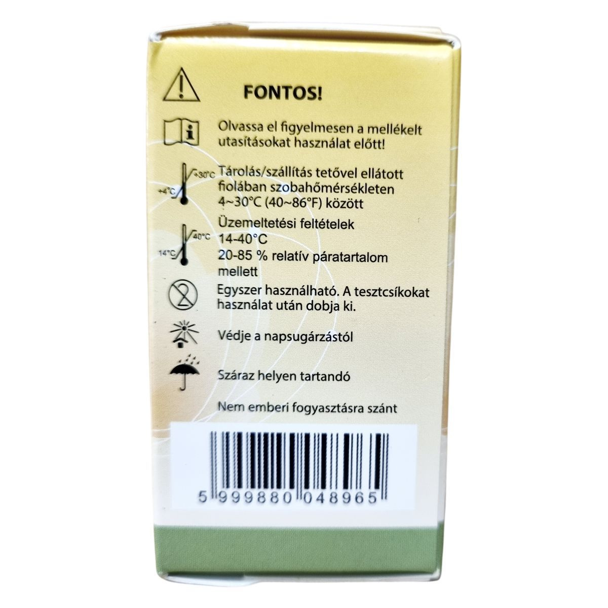 FONTOS! Olvassa el figyelmesen a mellékelt utasításokat használat előtt! Egyszer használható. A tesztcsíkokat használat után dobja ki. Nem emberi fogyasztásra szánt. Csak önellenőrzésre!