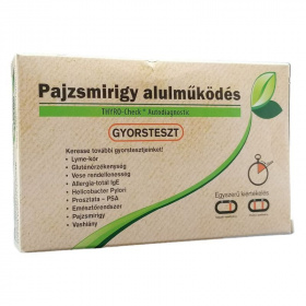A pajzsmirigy alulműködésnek számtalan fizikai és pszichés tünete lehet. Tesztelje egészségét egyszerűen, gyorsan a Pajzsmirigy alulműködés teszt segítségével! Ne feledje, minél előbb derül fény egy esetleges rendellenességre, a kellemetlen tünetek annál hamarabb megszűntethetőek! Melyek lehetnek a pajzsmirigy alulműködés tünetei? fáradékonyság, levertség, ingerlékenység, súlygyarapodás, étvágycsökkenés, feledékenység, koncentrációs zavar, depresszió, száraz bőr, töredezett haj, ritkuló testszőrzet, kopaszság, fázékonyság, székrekedés, menstruációs zavarok, terméketlenség, strúma (golyva) is kialakulhat, rekedt, mély hang, csökkent libidó, emelkedett koleszterin szint, szem körüli duzzanat, szívritmus zavar, csökkent pulzusszám. Kinek ajánlott elvégezni a Pajzsmirigy alulműködés tesztet? Azoknak, a nőknek, akik a fenti tüneteket tapasztalják, azoknak a férfiaknak, akik merevedési zavarokkal, impotenciával, alacsony libidóval küzdenek, azoknak, akiknek a családjában már fordult elő pajzsmirigy betegség. Mi idézhet elő pajzsmirigy alulműködést a szervezetben? Pajzsmirigy krónikus gyulladása, pajzsmirigy hormontermelésének zavara, elégtelen jódfogyasztás, izotóp-kezelés, pajzsmirigy műtéti eltávolítása. Mit tartalmaz a Pajzsmirigy alulműködés teszt? Pajzsmirigy alulműködés teszt tartozékok. A doboz a teszt elvégzéséhez szükséges eszközöket tartalmazza, mint: 1 db lezárt alumínium tasak, benne: 1 db tesztkazetta, 1 db műanyag pipetta, 1 db páraelszívó