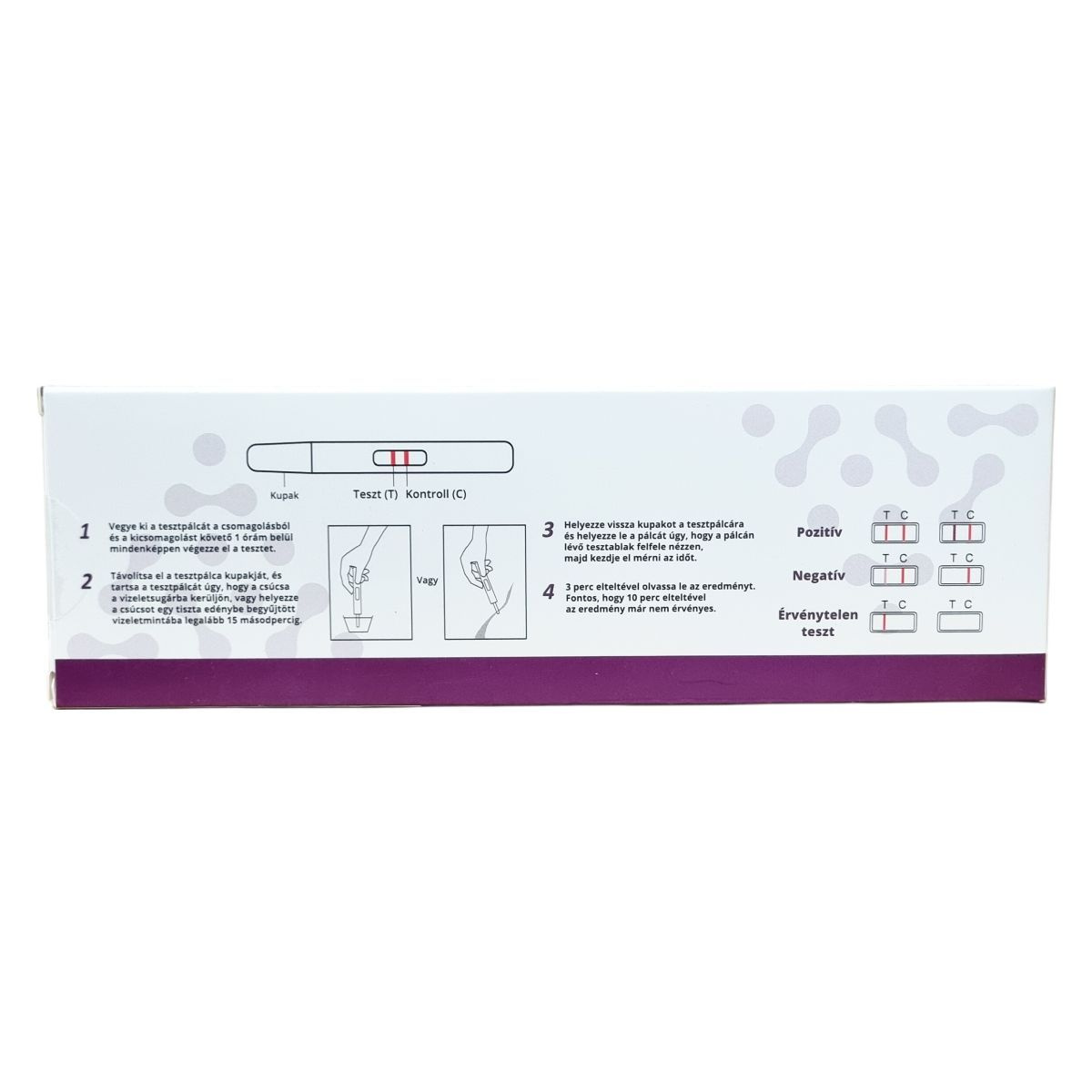 Vegye ki a tesztpálcát a csomagolásból, és azonnal végezze el a tesztet. Távolítsa el a kupakot, a pálca csúcsát helyezze a vizeletsugárba vagy vizeletmintába legalább 15 másodpercig. Helyezze vissza a kupakot, majd 3 perc múlva olvassa le az eredményt, amely 10 perc után már nem érvényes.
